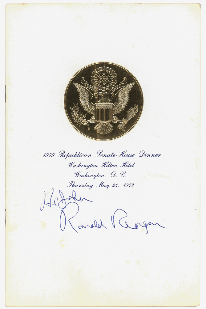 Program for the 1979 Republican Senate-House Dinner held at the Washington Hilton Hotel on May 24, 1979, four pages, 5.5 x 8.5, signed and inscribed on the front cover in blue ballpoint, "Hi John, Ronald Reagan." Included is a ticket for the event, issued as No. 1074 for Table Number 107. In fine condition. Originates from the estate of former Boston Mayor John F. Collins.