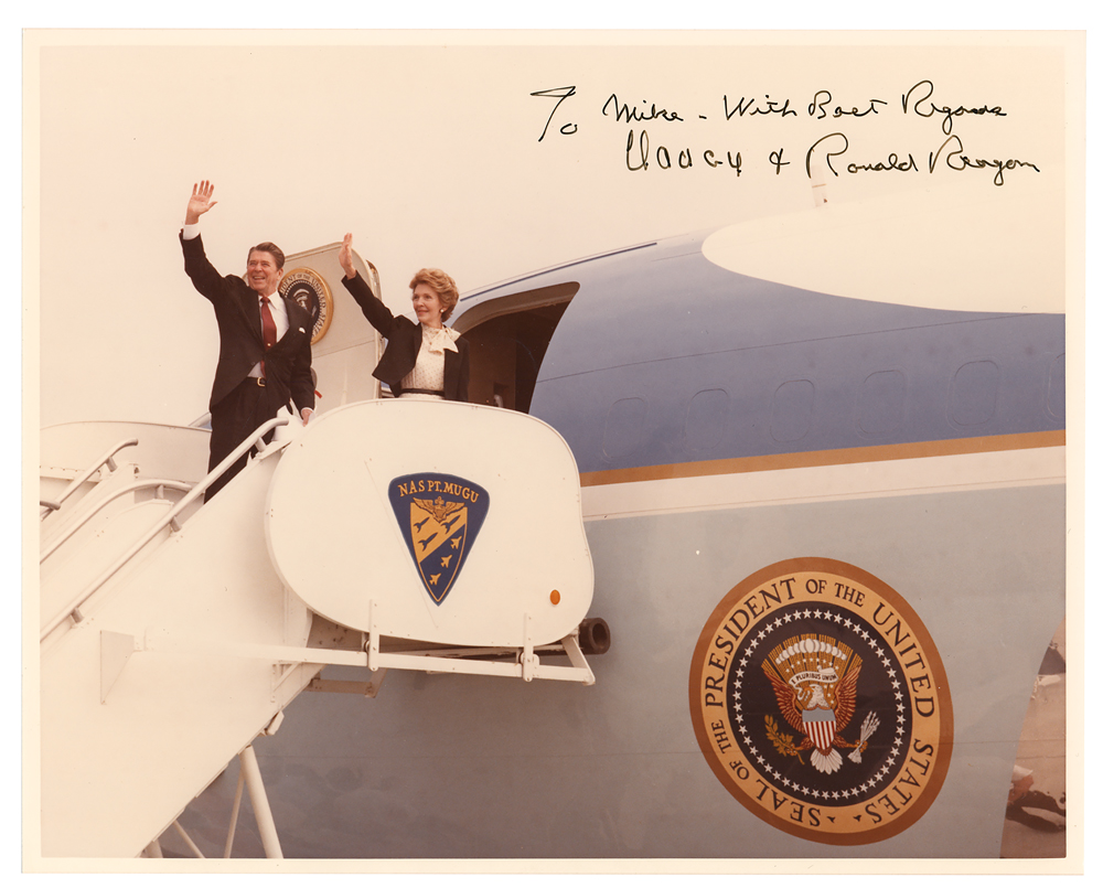 Color satin-finish 10 x 8 photo of the Reagans waving from the steps of Air Force One, signed and inscribed in black felt tip, "To Mike—With Best Regards, Ronald Reagan" and "Nancy.” In very good to fine condition, with scattered small surface creases.