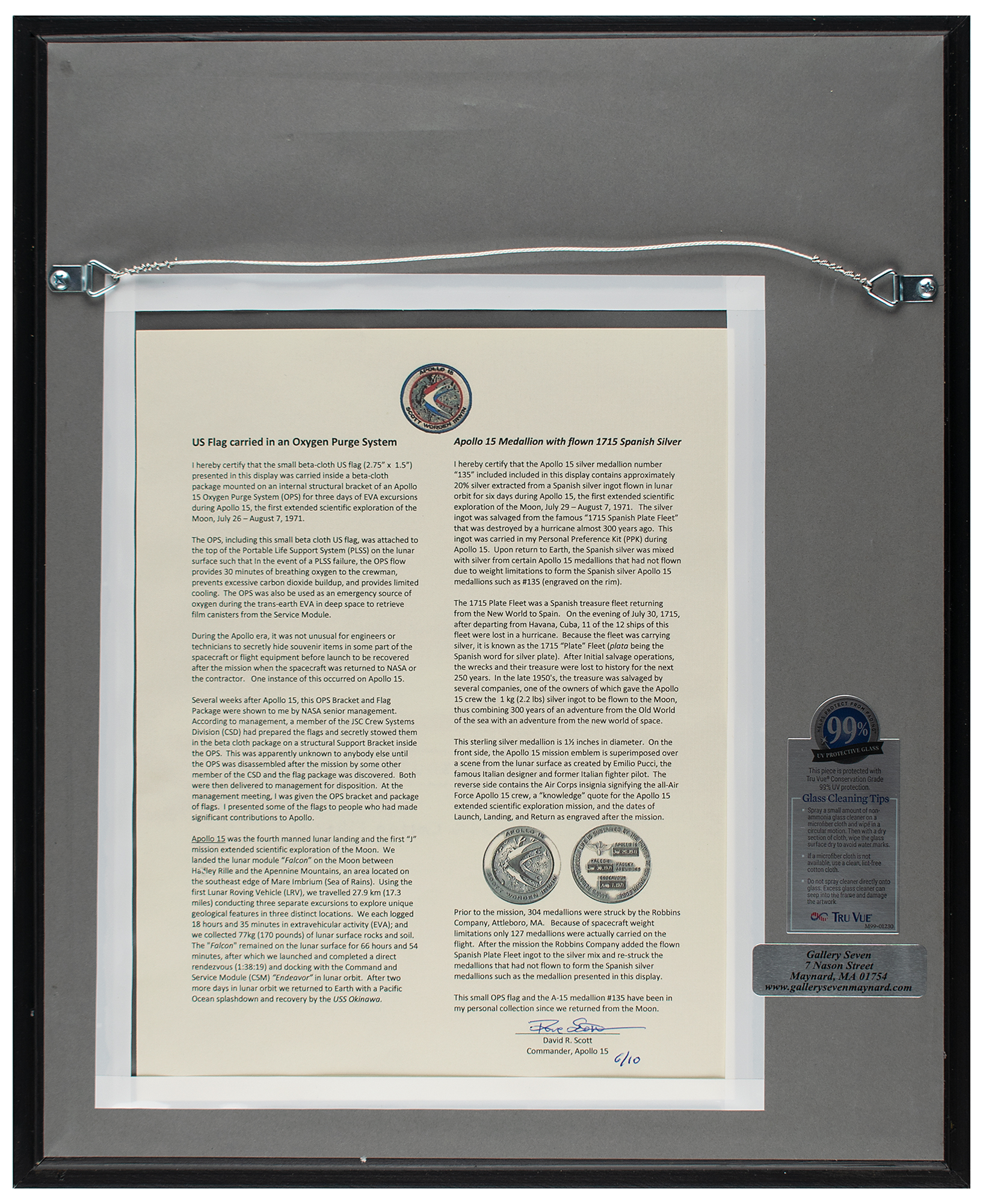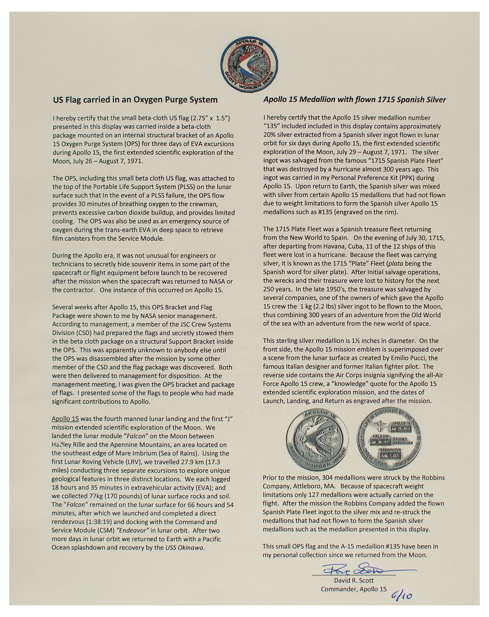 I hereby certify that the Apollo 15 medallion number '135' included in this display contains approximately 20% silver extracted from a Spanish silver ingot flown in lunar orbit for six days during Apollo 15…The silver ingot was salvaged from the famous '1715 Spanish Plate Fleet' that was destroyed by a hurricane almost 300 years ago. This ingot was carried in my Personal Preference Kit (PPK) during Apollo 15. Upon return to Earth, the Spanish silver was mixed with silver from certain Apollo 15 medallions that had not flown due to weight limitations to form the Spanish silver Apollo 15 medallions… This small OPS flag and the A-15 medallion #137 have been in my personal collection since we returned from the Moon."