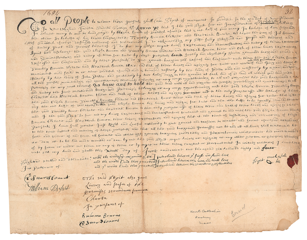Rare Indian land deed from 1684—colonists buy property on Cape Cod