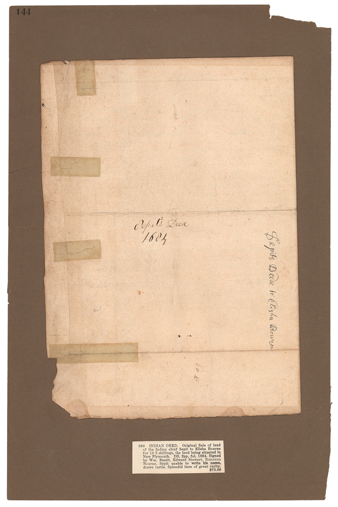 Manuscript DS, one page, 15 x 11.5, June 9, 1684. Original deed for the sale of Indian chief Joseph Sepit's land in New Plymouth to Elisha Bourne for one pound and one half sterling. Signed with famous Native American chief Joseph Sepit's 'turtle' pictograph and countersigned by William Bassit, Edward Stewart, and Runanna Bourne. Affixed to a larger scrapbook page with old catalog listing below. In very good to fine condition, with scattered toning, paper loss to the lower right edge, and old repairs to the back of the right edge. To reach Cape Cod today, one must drive over the Bourne Bridge to arrive in the town of Bourne. A splendid item of great rarity.