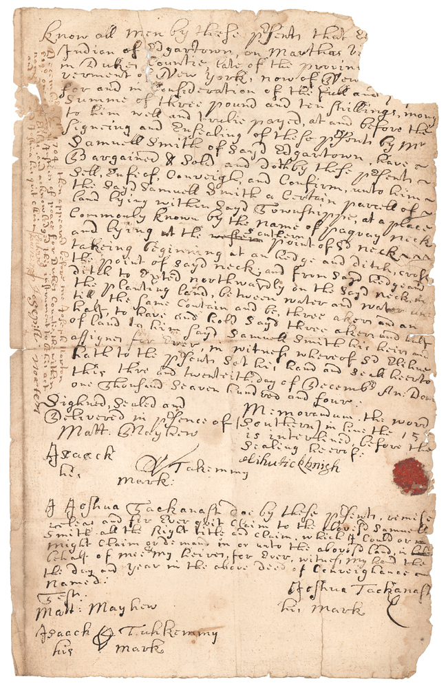 Manuscript DS, one page, 7.75 x 12, December 20, 1704. Incredibly rare deed signed by Native Americans from the Tackanash family, recording the sale of "a place commonly known by the native name of Paquay Neck lying at the southern point of said neck," from Joshua Tackanash, Isaac Tuhkimmy, and Elihu Tickknish to Samuel Smith of Edgartown, Martha's Vineyard. The signatures of the Native American sellers Isaac and Joshua are scribed symbols, Elihu writes his own name, and the left margin is signed by Joseph Norton. Docketed and signed on the reverse by Mathew Mayhew. In very good condition, with edge tears, paper loss, and some light staining.