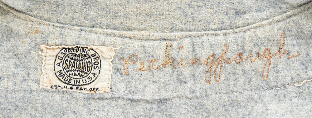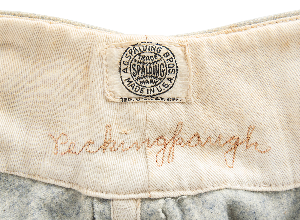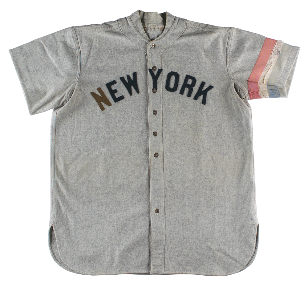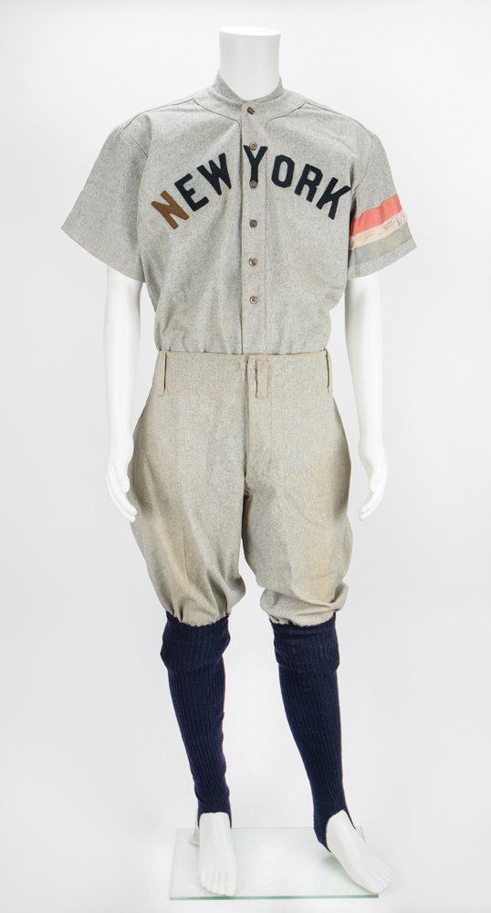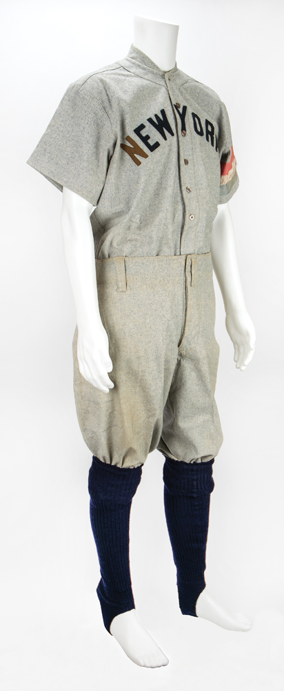 Any authentic, game-used uniform from the deadball era is virtually unheard of—that this comes from one of baseball's early stars, and arguably its most legendary franchise, makes this example truly remarkable. Known for his steady defense and stable demeanor, Peckinpaugh served as the Yankees' captain from 1914 to 1921. The special red, white, and blue armband allows us to date it precisely to 1918, a year in which Peckinpaugh turned more double plays than any other American League shortstop and also led the league in assists. A unique and exceptionally desirable early New York Yankees uniform, worn on the road by their capable captain.