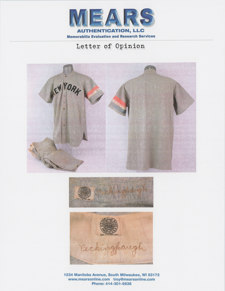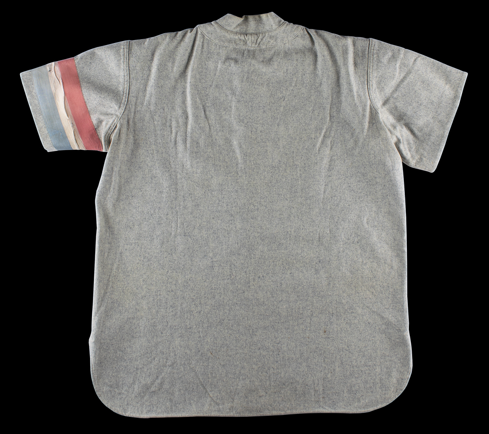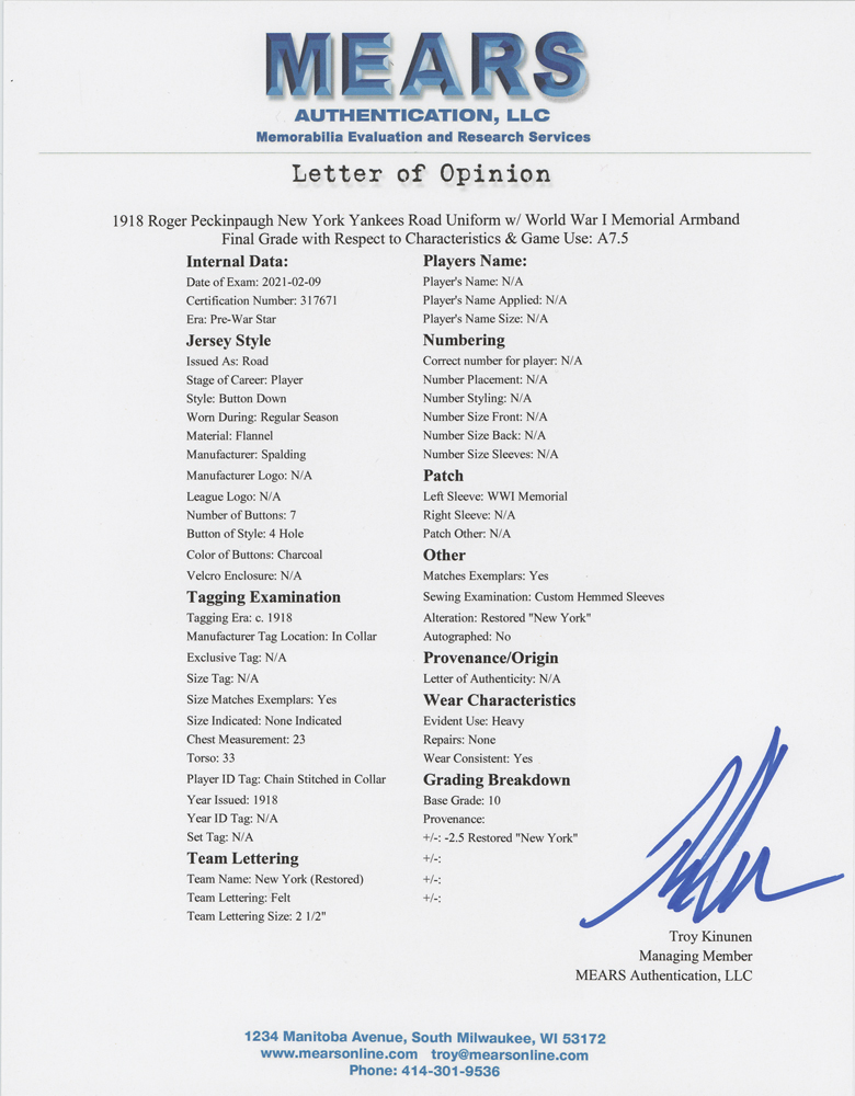 Roger Peckinpaugh's game-used New York Yankees road uniform from the 1918 season, including his jersey and pants. The button-down gray flannel jersey features "New York" (restored) across the chest and features a red, white, and blue silk World War I memorial armband on the left sleeve. It retains the proper Spalding manufacturer's tag in the collar, and has the player's surname chain-stitched to the right in light brown thread, "Peckingpaugh" [sic]. It has custom-hemmed sleeves, vented by underarm eyelets, and seven four-hole charcoal buttons down the front. The matching gray flannel pants feature a button-down fly and have the Spalding tag in the waistband, with "Peckingpaugh" chain-stitched below. Also includes two pairs of Peckinpaugh's navy blue stirrups. In fine condition, with significant evidence of use including general wear and light staining, some fraying to the white portion of the tricolor armband, and some fraying to bottoms of the pant legs. Accompanied by a letter of opinion from MEARS Authentication, evaluating the jersey as "A7.5" with respect to characteristics and game use.