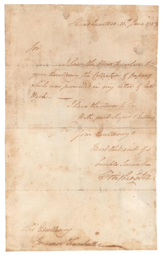 Revolutionary War-dated LS signed ?Go: Washington,? one page, 7.75 x 12.75, June 11, 1783. Written from the "Head Quarters" of the Continental Army, a letter to Connecticut Governor Jonathan Trumbull, forwarding paperwork relative to the reimbursement of Army officers, in full: "I have the honor to enclose to your Excellency the Collection of papers which was promised in my Letter of last Week. I have the Honor to be, With great Regard & Esteem, Sir Your Excellency's Most obedient & humble servant." In very good condition, with overall staining, and repairs on the reverse to fold separations.