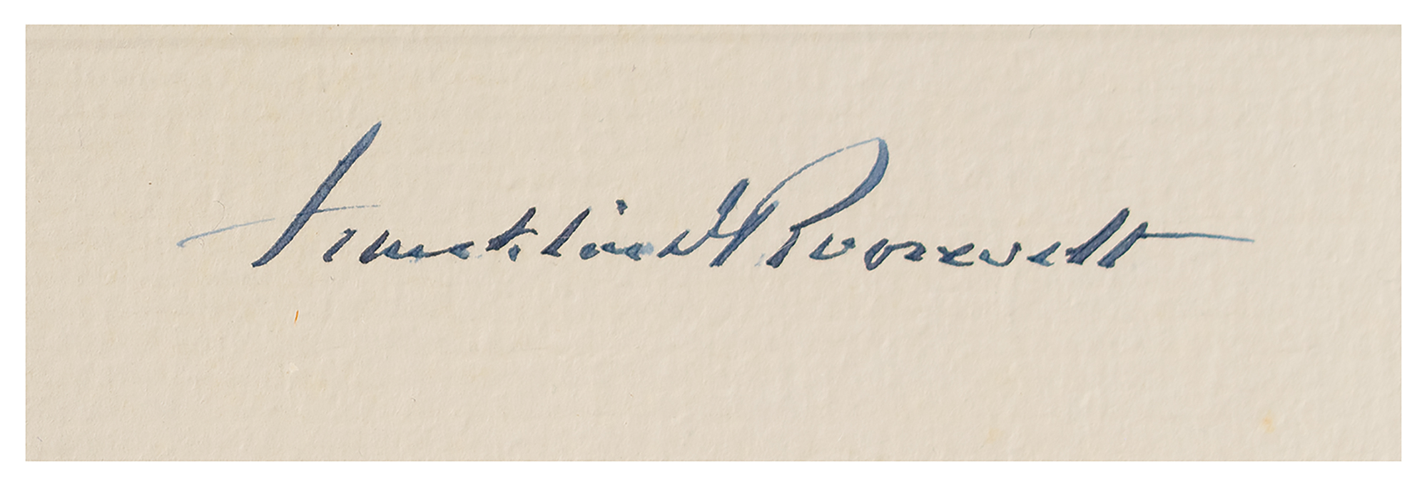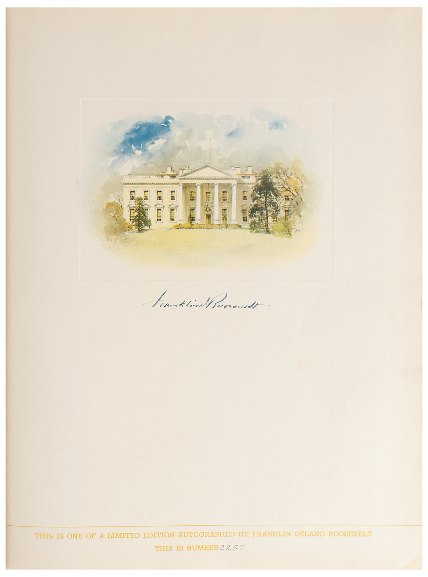 Signed book: The Democratic Book, 1936. Limited edition, numbered 2257 of an unspecified limitation. Gilt-stamped leatherbound hardcover, 11.5 x 14.5, 384 pages. Signed on the beautifully designed colophon in fountain pen by Roosevelt below a watercolor vignette of the White House. The original owner’s name, “James M. Tunnell,” is also stamped on the cover. Autographic condition: very fine. Book condition: VG/None, with scuffing and edgewear to leather.