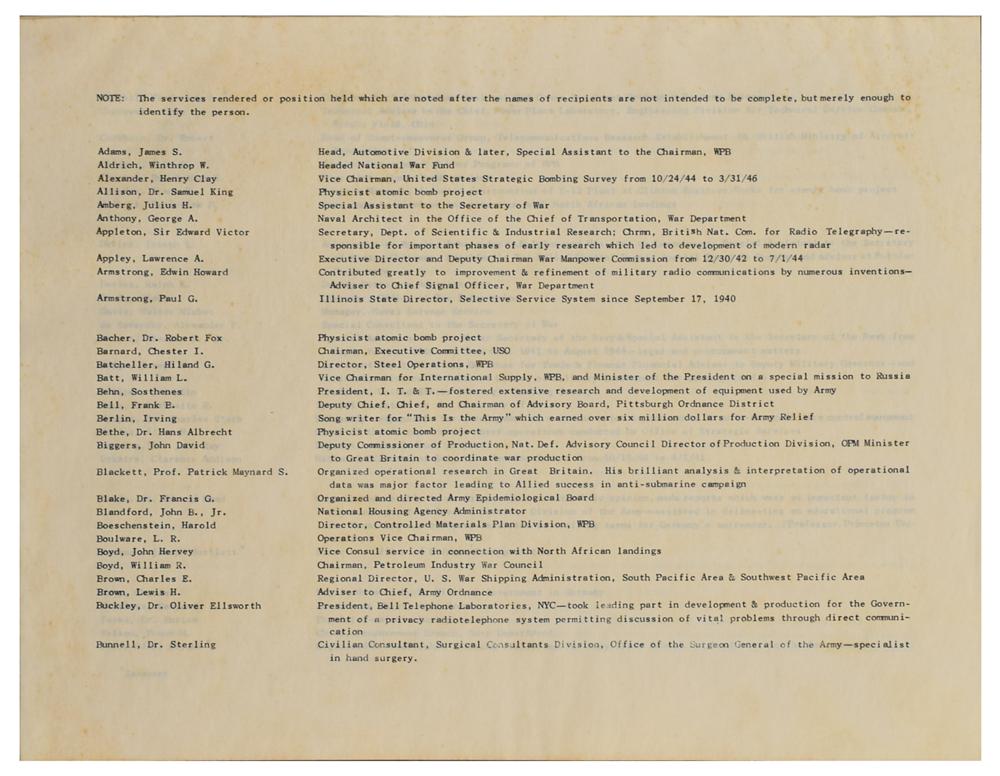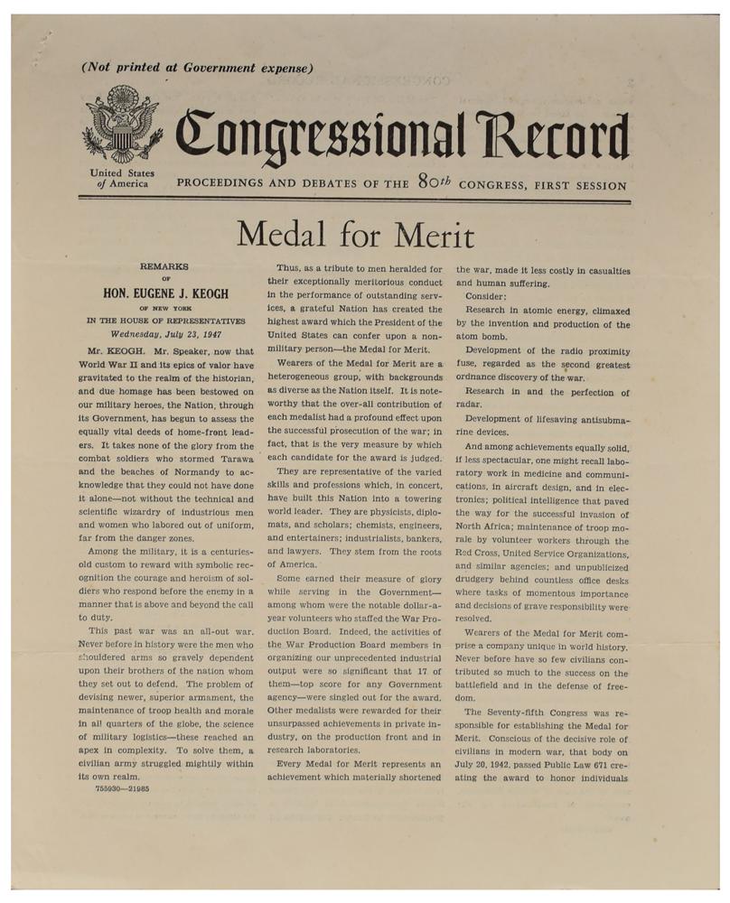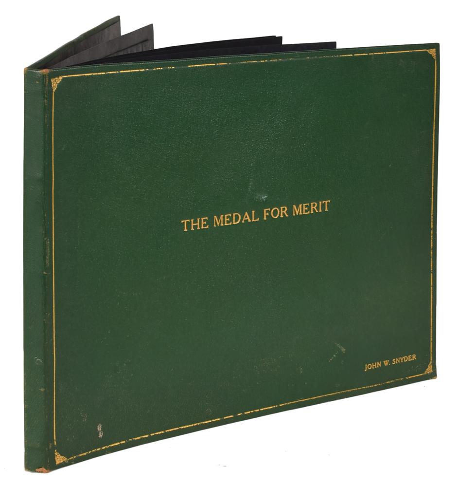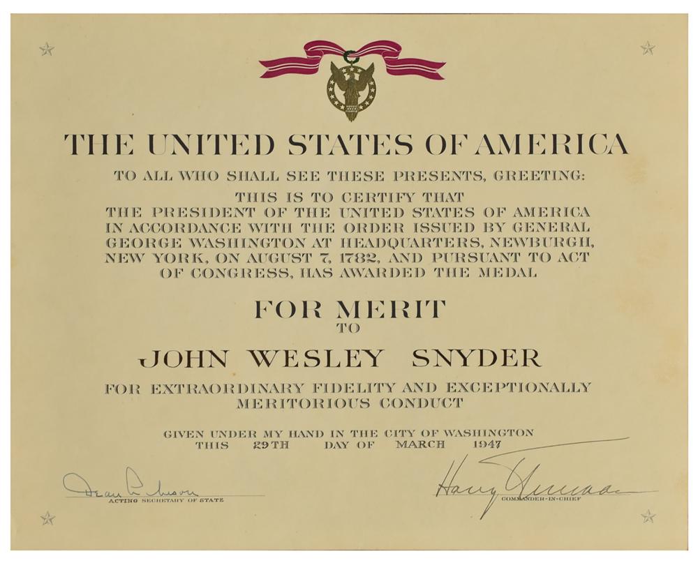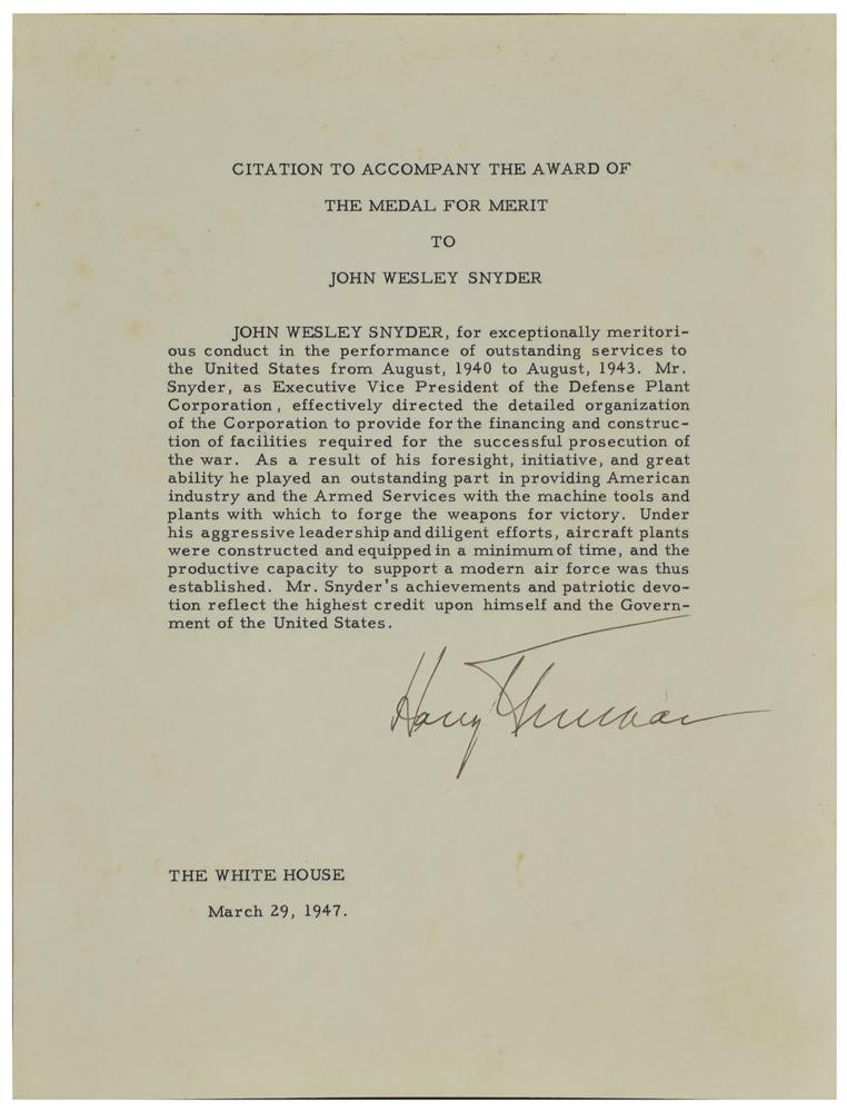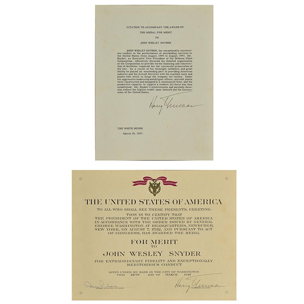 Historic custom-made green Morocco leather scrapbook, 14 x 11, imprinted on the front cover, "The Medal for Merit, John W. Snyder," containing two documents signed by Truman: a DS as president, one page, 12 x 9.75, March 29, 1947, in part: "The President of the United States of America in accordance with the Order issued by General George Washington at Headquarters, Newburgh, New York, on August 7, 1782, and pursuant to Act of Congress, has awarded the Medal for Merit to John Wesley Snyder for extraordinary fidelity and exceptionally meritorious conduct," signed at the conclusion by President Truman and Acting Secretary of State Dean Acheson; and a DS as president, one page, 8 x 10, March 29, 1947, headed, "Citation to Accompany the Award of the Medal for Merit to John Wesley Snyder," in full: "John Wesley Snyder, for exceptionally meritorious conduct in the performance of outstanding services to the United States from August, 1940 to August, 1943. Mr. Snyder, as Executive Vice President of the Defense Plant Corporation, effectively directed the detailed organization of the Corporation to provide for the financing and construction of facilities required for the successful prosecution of the war. As a result of his foresight, initiative, and great ability he played an outstanding part in providing American industry and the Armed Services with the machine tools and plants with which to forge the weapons for victory. Under his aggressive leadership and diligent efforts, aircraft plants were constructed and equipped in a minimum of time, and the productive capacity to support a modern air force was thus established. Mr. Snyder's achievements and patriotic devotion reflect the highest credit upon himself and the Government of the United States." Also affixed inside the scrapbook are an image of the Medal for Merit, an original Acme Newspictures photo of President Truman presenting the medal to Snyder, newspaper clippings concerning the award, and a typescript of a list of recipients of the award, as well as a laid in copy of the list published in the Congressional Record. In overall fine condition, with light wear to the leather covers. As head of the Defense Plant Corporation, Snyder directed the financing of the facilities at Oak Ridge for the construction of the atomic bombs dropped on Hiroshima and Nagasaki, which effectively ended World War II.