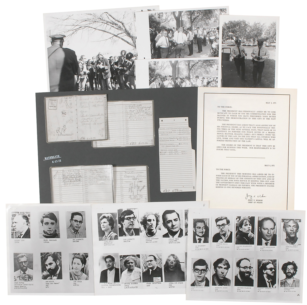 Photographic police archive documenting the 1971 May Day protests and the 1972 Watergate burglary, consisting of: seven photos, 5 x 7 and 10 x 8, including composites of headshots for identification purposes, showing people like Yippies Jerry Rubin and Abbie Hoffman, as well as Weather Underground members Linda Sue Evans and Bernardine Dohrn, as well as candid photos from the protests; a series of five smaller photos cropped and affixed to a 14 x 11 board, documenting the 1971 May Day protests and the Watergate burglary of June 1972; and a printed document. In overall fine condition. The archive originated from the estate of Cecil Wayne Kirk, a DC Metropolitan policeman and photographic expert, who would later serve as an expert witness in the 1978 Congressional hearings reexamining the assassination of John F. Kennedy.