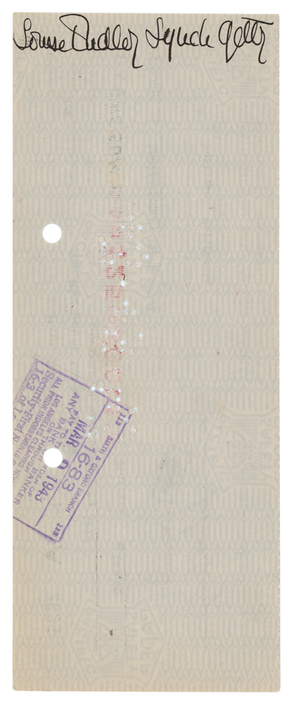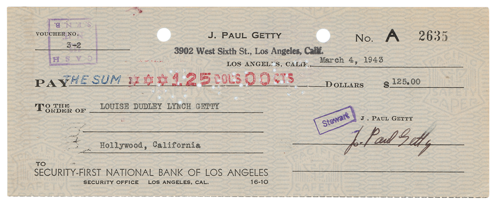 Personal check, 8.5 x 3.25, filled out in type and signed by Getty, "J. Paul Getty," payable to his wife, Louise Dudley Lynch Getty, for $125, March 4, 1943; endorsed on the reverse by her, "Louise Dudley Lynch Getty." In fine condition, with a slight brush to the signature. An author and singer, Louise 'Teddy' Getty was married to J. Paul Getty from 1939 to 1958.