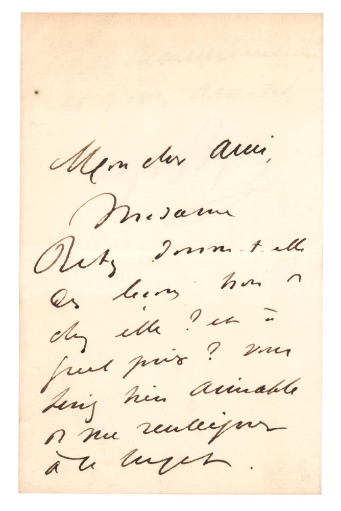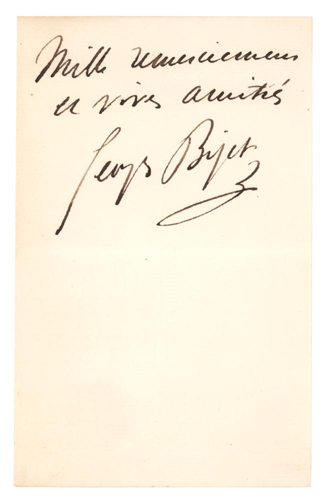 French composer (1838-1875) whose operatic masterpiece, Carmen, was completed just before his untimely death from heart disease. Boldly penned ALS in French, two pages on two adjoining sheets, 4 x 6.25, no date. Letter inquiring about music lessons, in part (translated): "My dear friend, Is Madam Retz giving lessons at home or outside? And at what price? You will be very kind to give me all the information about this." In fine condition.