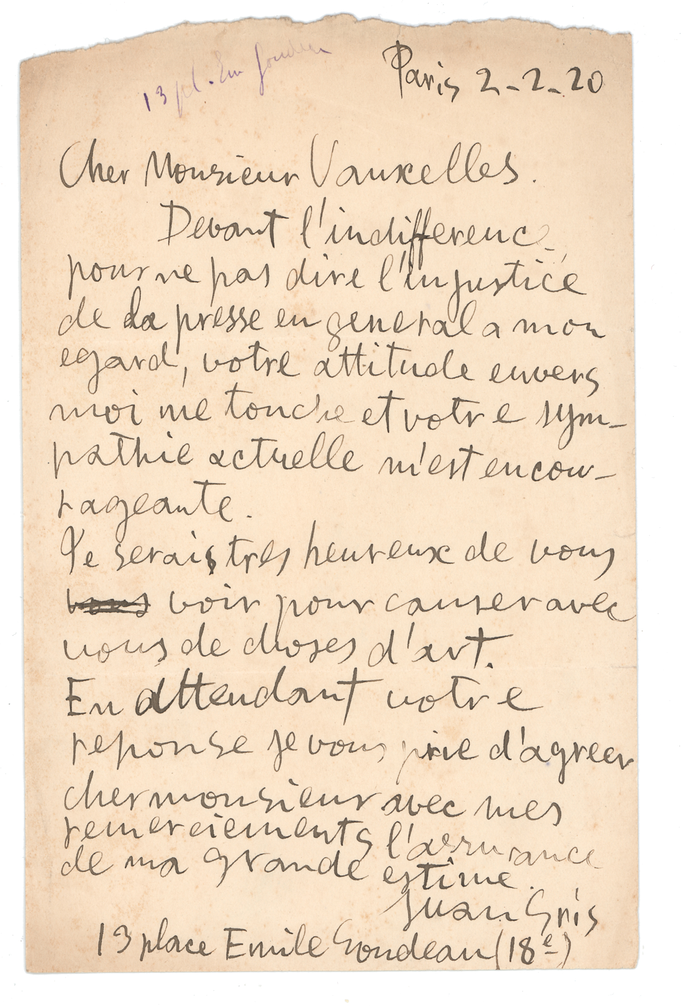 Spanish painter and sculptor (1887-1927) associated with Cubism. Scarce ALS in French, one page, 5 x 8, February 2, 1920. Letter to influential art critic Louis Vauxcelles, who is credited with coining the terms 'Fauvism' and 'Cubism,' thanking him for his encouragement. In part (translated): "Having to face not only the indifference, but I would even say the injustice of the press in general toward me, your attitude on my behalf touches me and your present sympathy is a great encouragement. I would be all too happy to see you to speak with you about artistic things. While I wait for your answer, I will ask you to accept, dear sir, with my thanks, the expression of my great esteem." In fine condition, with a rough top edge. An important letter associating a then-unrecognized artist with a major critic.