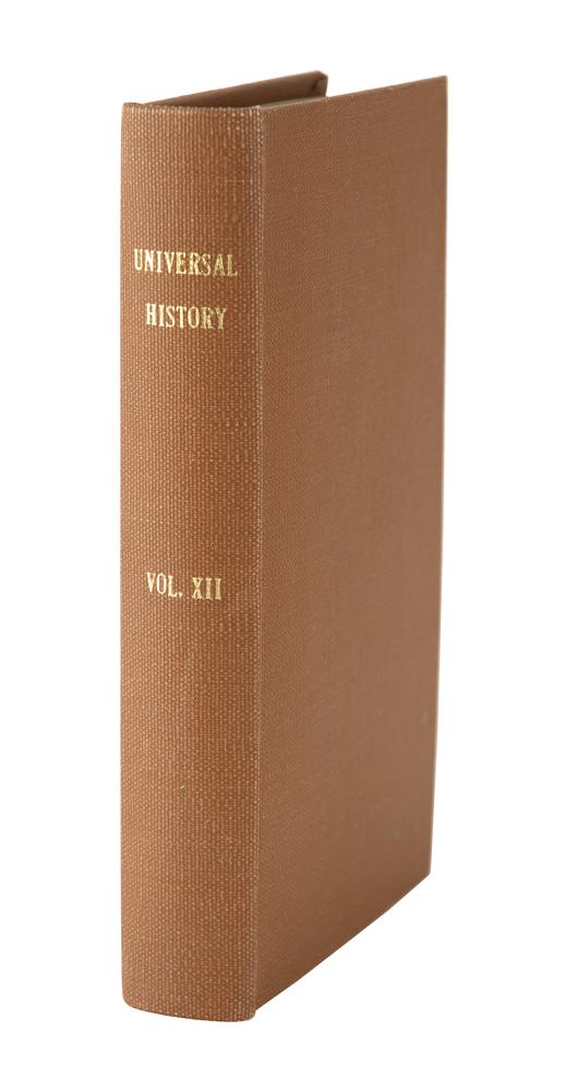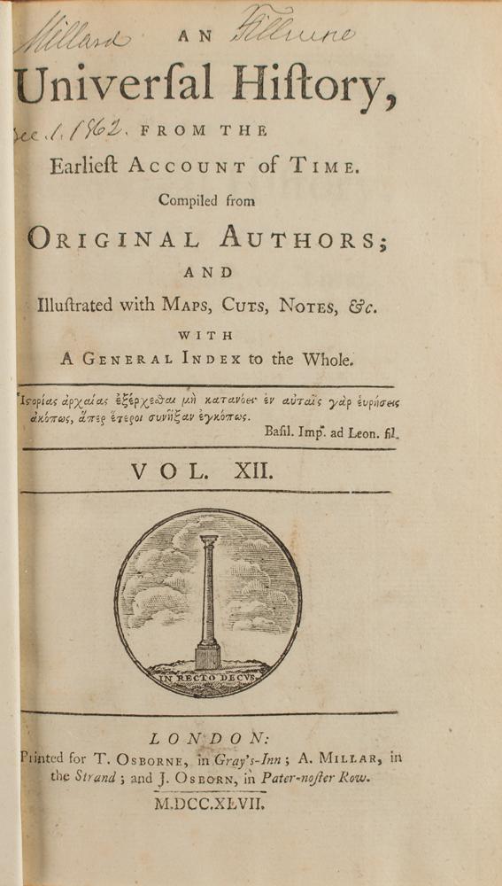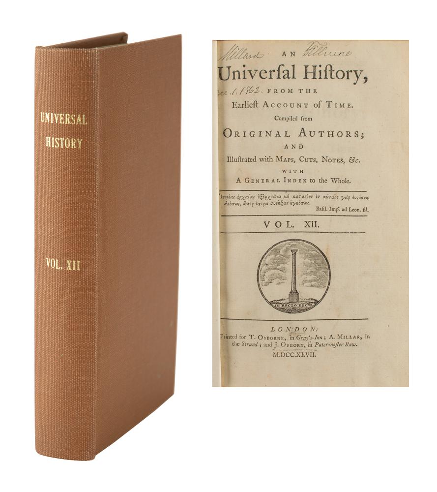 Signed book from Fillmore's personal library: Universal History, from the Earliest Account of Time, Vol. XII. London: T. Osborne, 1747. Rebound hardcover, 5.5 x 8.5, 500 pages. Signed on the title page in black ink with his ownership signature, "Millard Fillmore, Dec. 1, 1862." Complete with five fold-out maps of ancient Rome. Autographic condition: fine, with some light soiling to the signed page. Book condition: VG/None.