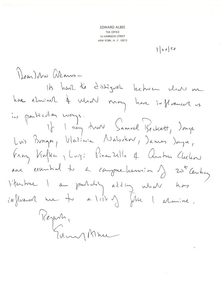 ALS, one page, 8.5 x 11, personal letterhead, January 20, 1990. Letter to John Adams, listing some of his influences: "Samuel Beckett, Jorge Luis Borges, Vladimir Nabokov, James Joyce, Franz Kafka, Luigi Pirandello & Anton Chekhov are essential to a comprehension of 20th century literature." In fine condition.