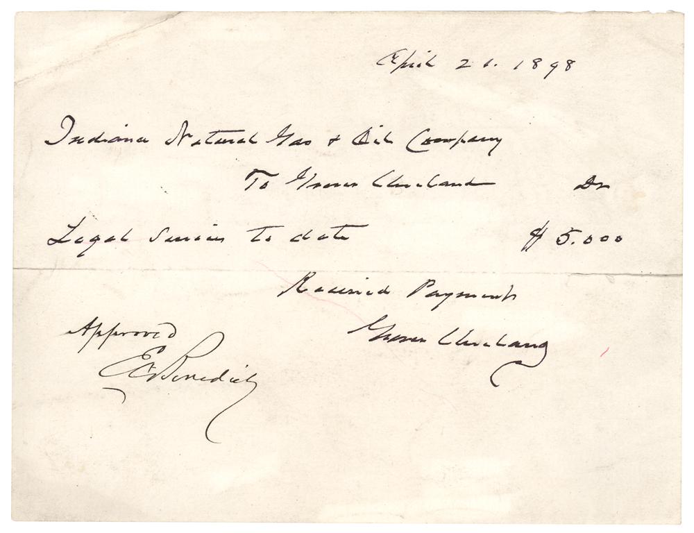 Autograph document signed twice by Grover Cleveland, one page, 6.5 x 5, April 21, 1898. A payment receipt: "Indiana Natural Gas & Oil Company, To Grover Cleveland, Legal services to date, $5,000, Received Payment." Signed neatly at the conclusion by Cleveland, and countersigned by a secretary. In very good to fine condition, with creases to the corners, and splitting to the ends of the central horizontal fold.