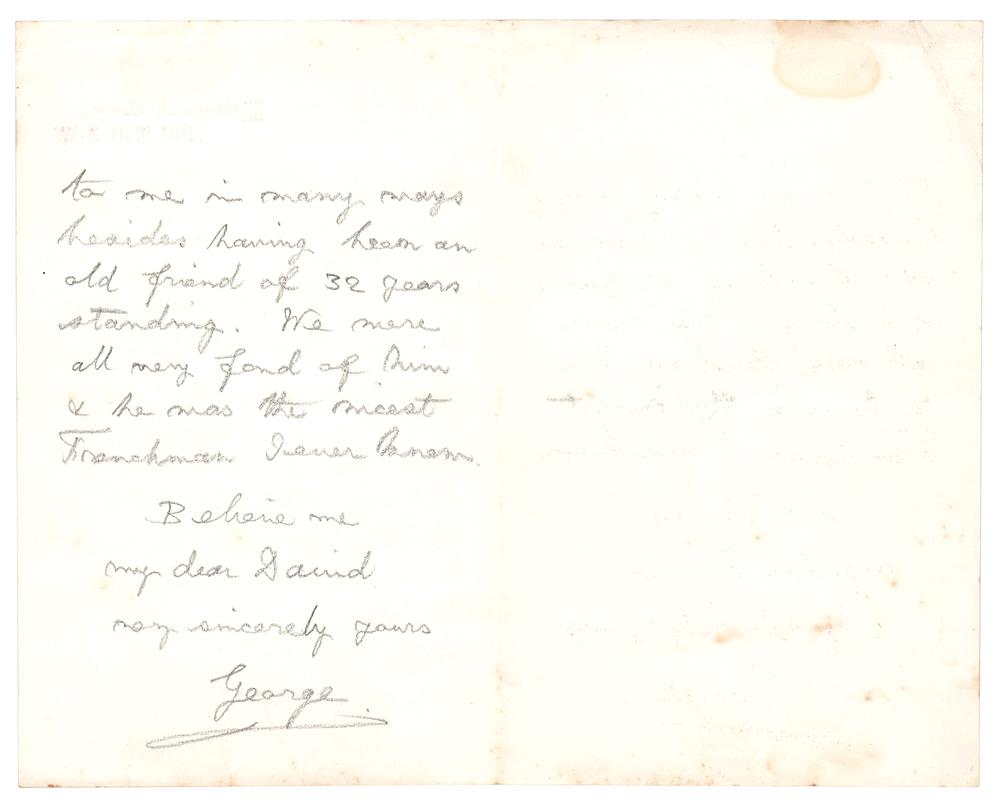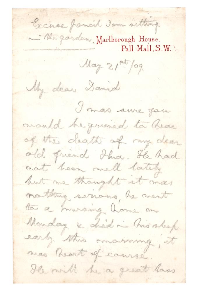 ALS in pencil signed “George,” one page both sides, 4.25 x 7, Marlborough House letterhead, May 21, 1909. Letter to David, in part: "I was sure you would be grieved to hear of the death of my dear old friend?He had not been well lately but we thought it was nothing serious, he went to a nursing home on Monday & died in his sleep early this morning, it was heart of course. He will be a great loss to me in many ways besides having been an old friend of 32 years standing. We were all very fond of him & he was the nicest Frenchman I ever knew." George adds at the top of the first page: "Excuse pencil I am sitting in the garden." In fine condition, with some light creasing.
