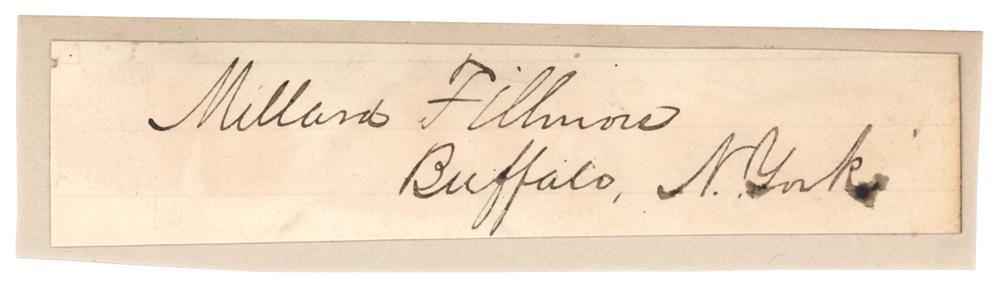 Ink signature, "Millard Fillmore, Buffalo, N. York,” on an off-white 4.25 x 1 slip affixed to a slightly larger mount. In fine condition, with some faint staining.