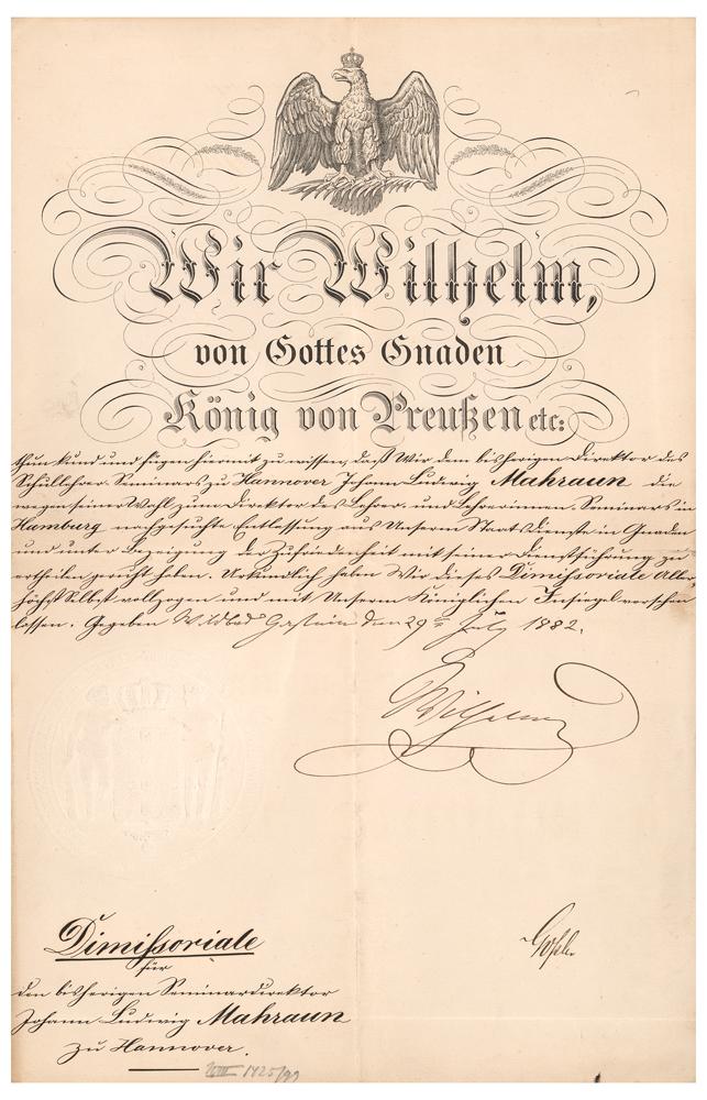 Manuscript DS in German, signed “Wilhelm,” one page, 9 x 14, July 29, 1882. Untranslated official document, neatly signed at the conclusion by Kaiser Wilhelm I. In fine condition.