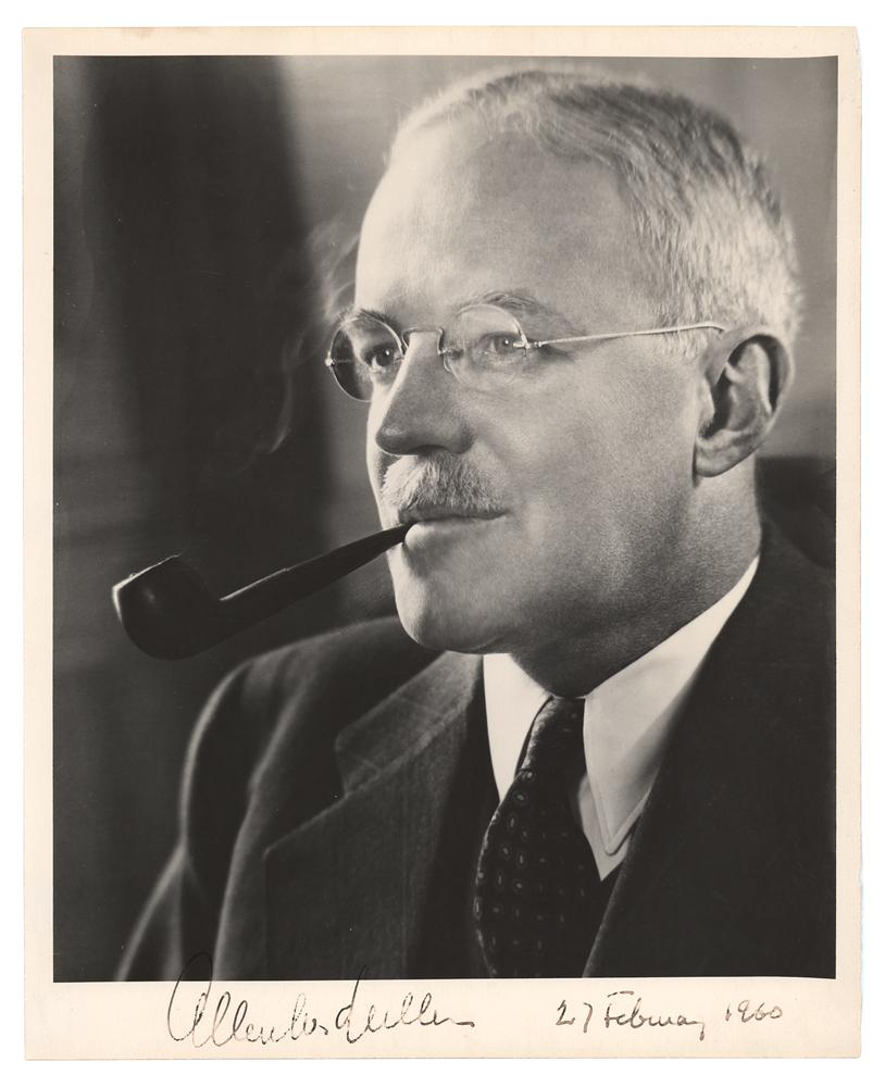 American diplomat and lawyer (1893-1969) who became the first civilian director of the CIA. Vintage matte-finish 8 x 10 lightweight photo of Dulles smoking a pipe, signed in the lower border in fountain pen as the director of Central Intelligence, "Allen W. Dulles, 27 February 1960." In fine condition, with some faint rippling to the lower right corner of the image.