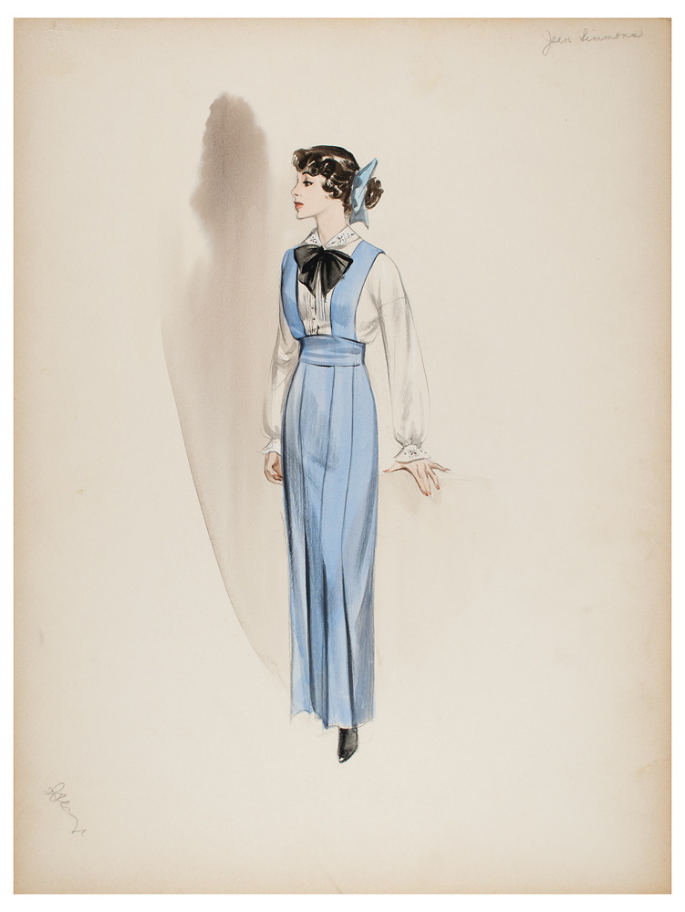 Actress Jean Simmons for the 1953 MGM comedy-drama The Actress, which shows her wearing a long light blue dress with white blouse and a black bow to collar, with the reverse stamped as “Prod. No. 1617, Sketch No. 2922, Name Jean Simmons, Fitter Jake, Date 12/22/52, Sequence #10.”