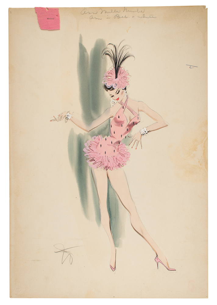 A chorus girl from the 1955 MGM musical Hit the Deck, which shows the dancer dressed in a short pink dress with a cross front halter neck and matching hat, a sample of which is affixed to the top edge, which is marked “Ann Miller number, Ann in Blk & White,” and the reverse is stamped as “Prod. No. 1659, Sketch No. 4135, Name Chorus Girls, Fitter K. Mc & Suzanne, Date 7/28/54, Sequence #1.”
