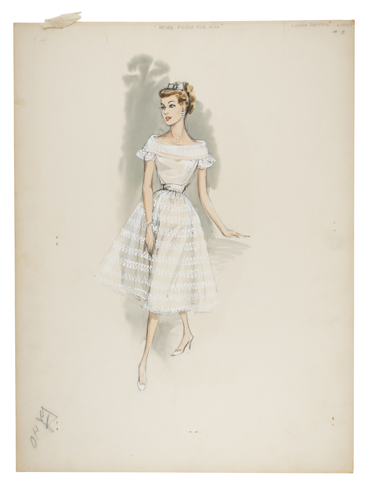 Actress Luana Patten for the 1960 MGM drama Home from the Hill, which shows her wearing a lovely white dress with open shoulders, a sample of which is stapled to the upper left edge, and the reverse stamped as “Prod. No. 1754, Sketch No. 119, Name Luana Patten, Fitter Bruce, Sequence Ch. #3.” In overall fine condition, with some wear and toning to edges, which could be easily matted out if so desired.