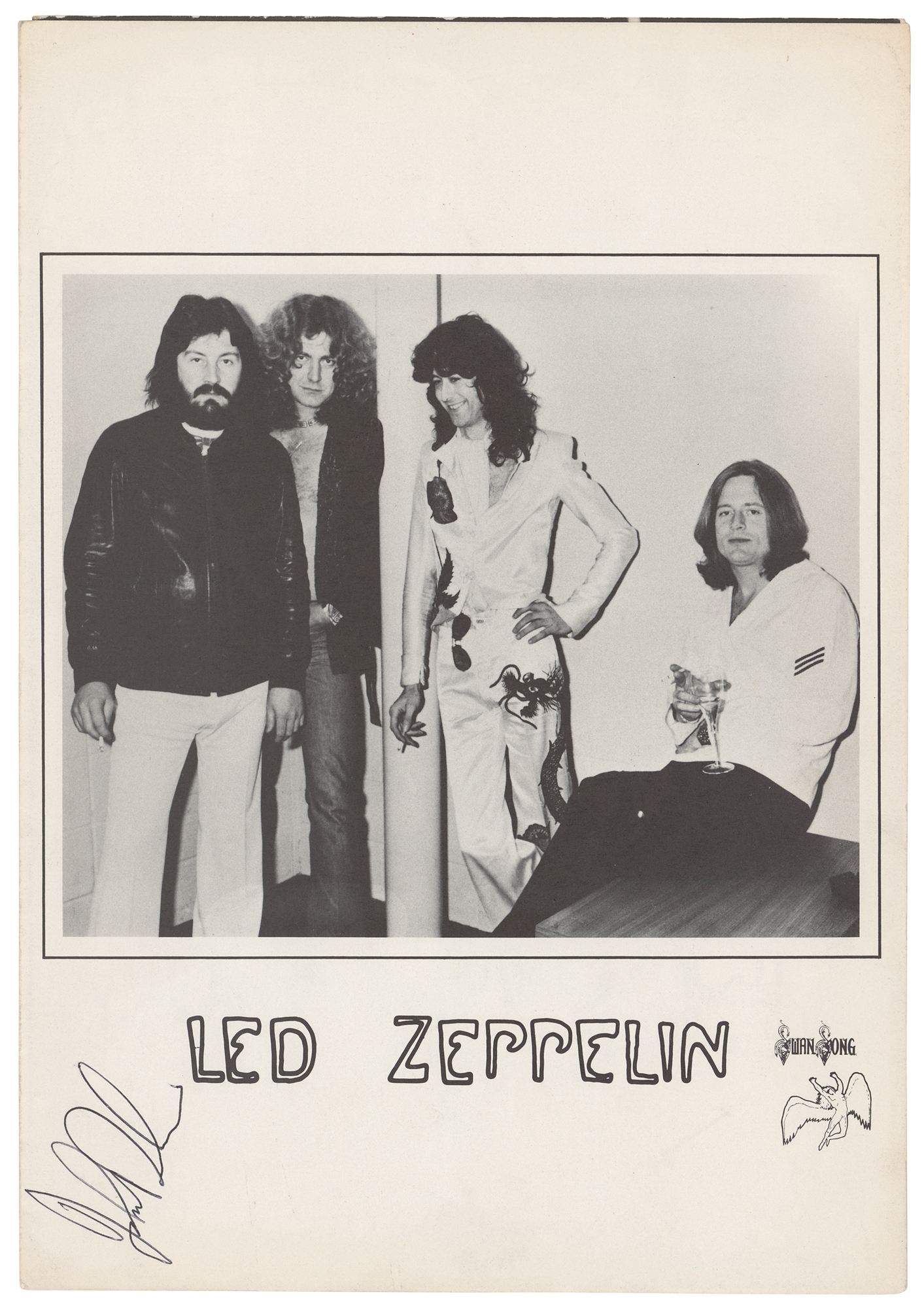 Original Swan Song Records promotional tri-fold booklet for Led Zeppelin's 1977 Tour of the United States, 8.25 x 11.75, signed on the front cover in black ballpoint by John Bonham. In fine condition. Accompanied by a certificate of authenticity from Tracks.