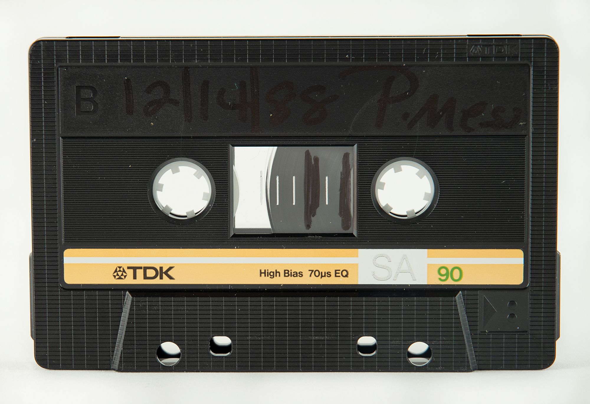 TDK SA cassette tape from an answering machine containing two voice messages from Prince, with B side of tape annotated in black felt tip: “12/14/88 P. Mess.” The contents of the tape have been transferred to a digital audio disc. The first Prince message can be found on the first track at marker 3:55, in full: “Karen, can you have Ashley bring by food? When it's ready, she can just leave it in the kitchen. Thanks."