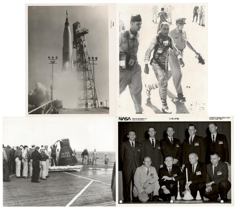 Other subjects include: Gus Grissom following his Mercury recovery; an interior cut-section of the Gemini spacecraft, with uncommon stapled print caption card; Robert H. Goddard; Ham the chimpanzee; the Vanguard 1 satellite; Skylab’s Earth Resource Experiment Package; the recovery of a Mercury capsule; NASA Astronaut Group 2; Gemini 4 astronauts Jim McDivitt and Ed White; the launch of the Mercury-Atlas 9; the launches of the AS-201 and AS-202 uncrewed test flights; and concept artwork of NASA’s six manned space programs. In overall very good to fine condition, with wear to edges, such as staple holes and creases, and punch holes to lower border of the NASA Astronaut Group 2 photo.