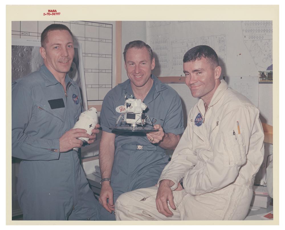 Official 'Type 1' color glossy 10 x 8 red-numbered NASA photo (S70-70-34767), showing the Apollo 13 prime crew—Jack Swigert, Jim Lovell, and Fred Haise—posing with spacecraft modules during pre-flight activities. Reverse bears "A Kodak Paper" watermarks and purple NASA caption text. In fine condition.