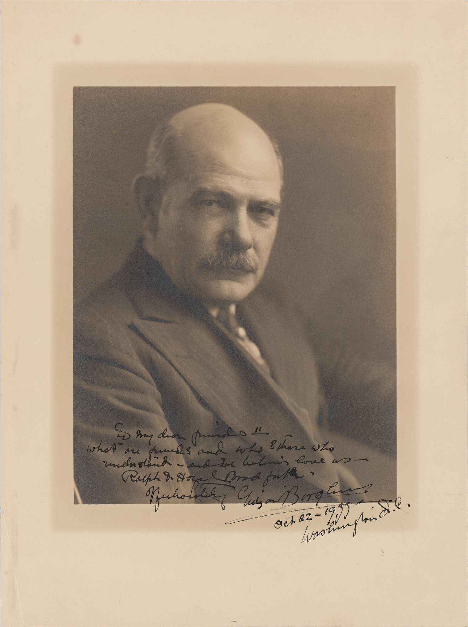 Matte-finish 10 x 13.5 photo, signed and inscribed in fountain pen, "To my dear friends—What are friends and who? Those who understand—and we believe love us—Ralph & Hazel Bradford, affectionately, Gutzon Borglum, Oct 22-1933, Washington D.C." In fine condition, with a few light border stains, and a crease to the lower left corner. Ralph Bradford, a writer and manager of the Corpus Christi Chamber of Congress, was a close friend of Borglum and employed him while planning the redevelopment of the Corpus Christi waterfront in the late 1920s. He produced several models of his sweeping redesign of the bayfront, which called for a smooth seawall resembling an amphitheater topped by parapets, a grand boulevard dotted with parks, and an imposing 32-foot statue of Christ atop the rock jetties in the bay. The plan was eventually tabled, though postwar construction somewhat resembled his plans. A fascinating association with one of Borglum's unrealized artistic visions.