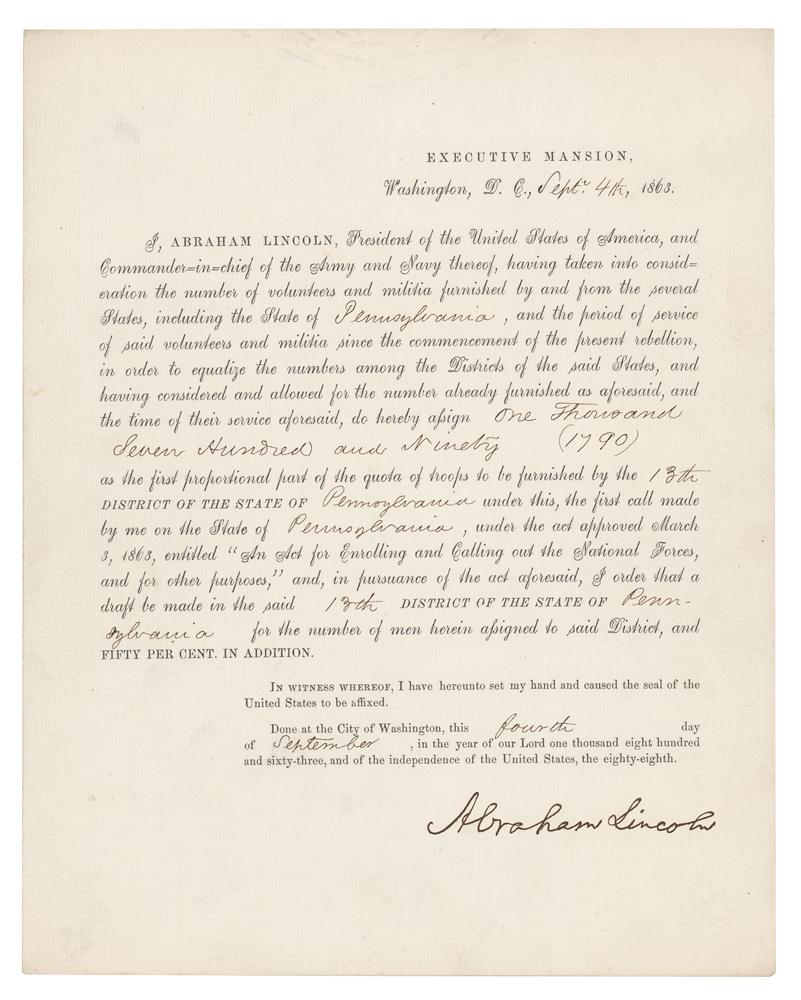 Civil War-dated partly-printed DS as president, signed “Abraham Lincoln,” one page, 7.75 x 9.75, September 4, 1863. Draft order for the Union Army issued by President Lincoln from the Executive Mansion, sent to the War Department. In part: "I, Abraham Lincoln, President of the United States of America, and Commander-in-chief of the Army and Navy thereof, having taken into consideration the number of volunteers and militia furnished by and from the several States, including the State of Pennsylvania, and the period of service of said volunteers and militia since the commencement of the present rebellion, in order to equalize the numbers among the Districts of the said States, and having considered and allowed for the number already furnished as aforesaid, and the time of their service aforesaid, do hereby assign one thousand seven hundred and ninety (1790) as the first proportional part of the quota of troops to be furnished by the 13th District of the State of Pennsylvania under this, the first call made by me on the State." Boldly signed at the conclusion by President Lincoln. In fine condition, with an area of creasing to the center of the top edge.