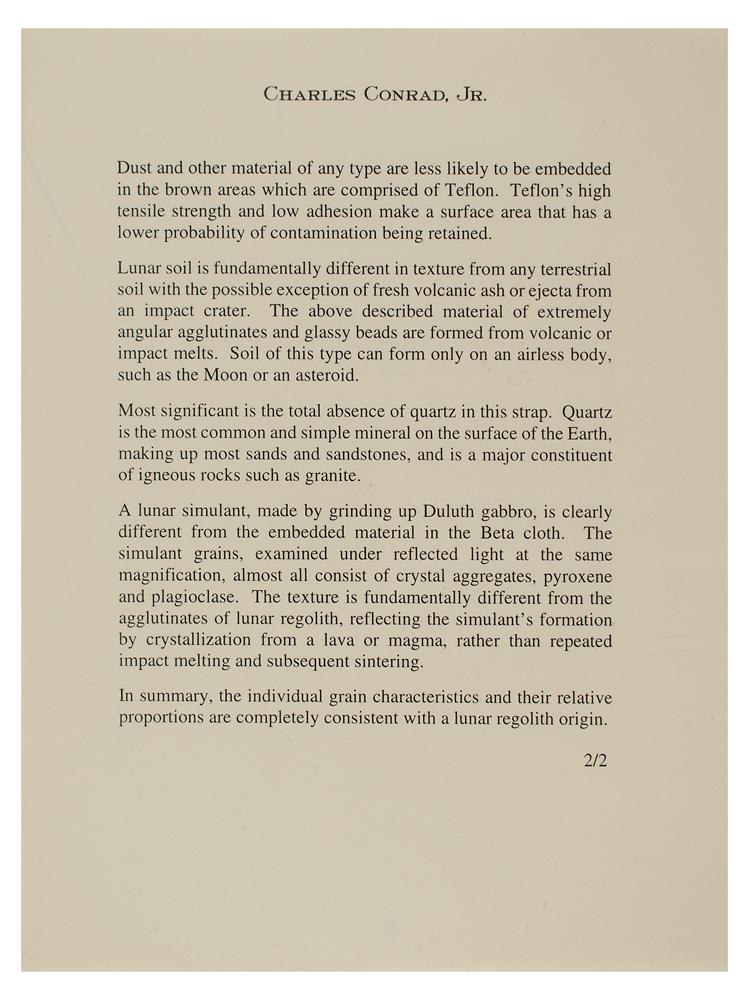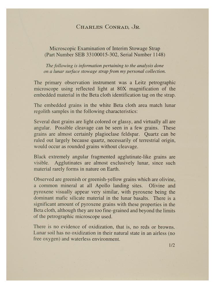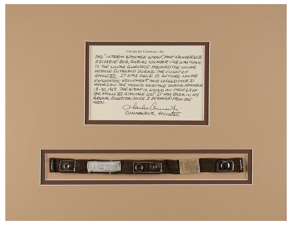 Flown Lunar Module interim stowage strap carried to the lunar surface during the Apollo 12 mission, measuring 10.5″ long, with sewn-on white Beta cloth part identification tag: "SEB 33100015-302, S/N 1148." The brown teflon strap, used to secure lunar exploration equipment within the spacecraft, features several alternating swatches of Velcro and metal snaps and has lunar dust embedded in the white Beta cloth area. Includes a handwritten letter of provenance signed by Apollo 12 Commander Charles Conrad, in full: "This 'interim stowage strap,' Part Number SEB 33100015-302, Serial Number 1148 was flown to the lunar surface aboard the Lunar Module Intrepid during the flight of Apollo XII. It was used to secure lunar exploration equipment and logged over 31 hours on the moon's surface during November 19-20, 1969. The strap is listed on page 63 of the Apollo XII stowage list. It has been in my personal collection since I returned from the moon." Also includes a two-page typed document on Conrad's personal letterhead, documenting a microscopic examination of the strap, outlining the characteristics by which the "embedded grains in the white Beta cloth area match lunar regolith samples." In fine condition.