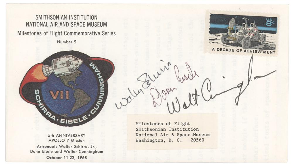 Smithsonian Institution commemorative cover with a cachet honoring the 5th anniversary of the Apollo 7 mission, signed in black ink and felt tip by Wally Schirra, Donn Eisele, and Walt Cunningham. In fine condition.