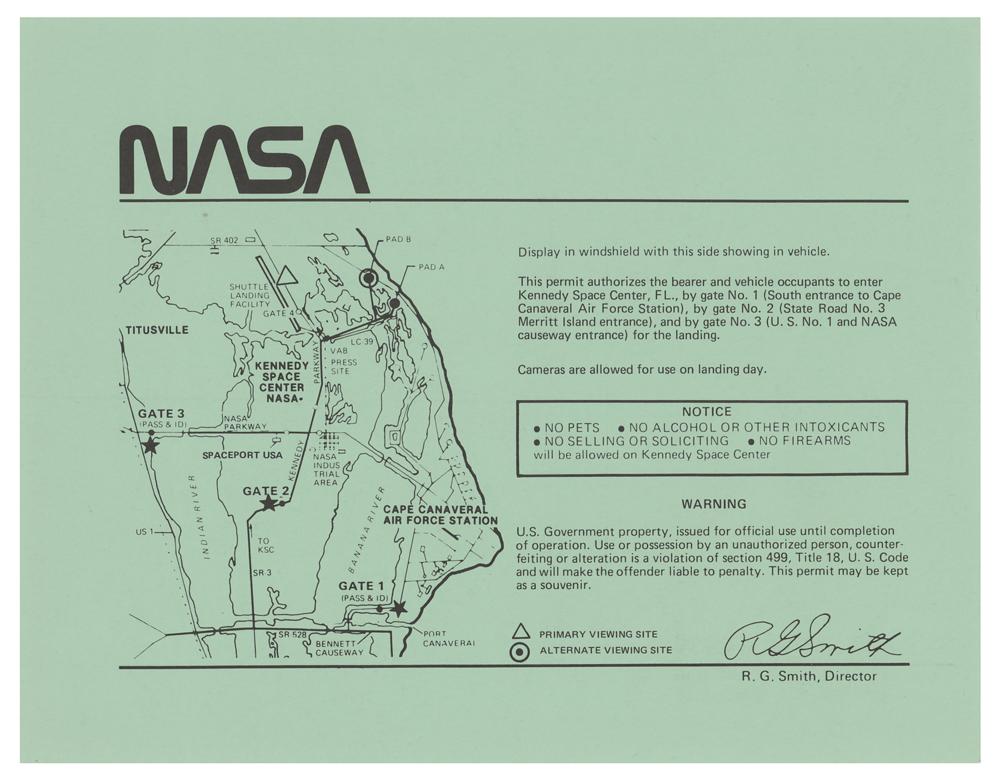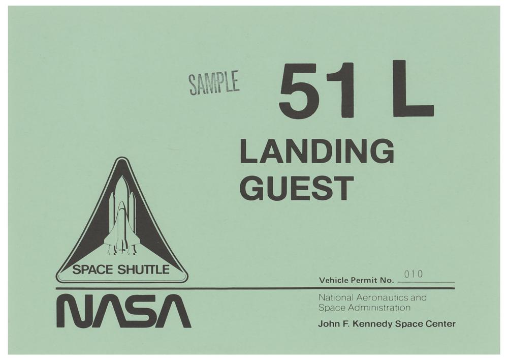 Original NASA 11 x 8.5 vehicle permit for the launch of the ill-fated STS-51-L mission at Kennedy Space Center Launch Complex 39B on January 28, 1986, issued as No. 10, with permit marked "Landing, Guest" and stamped "Sample." In fine condition.