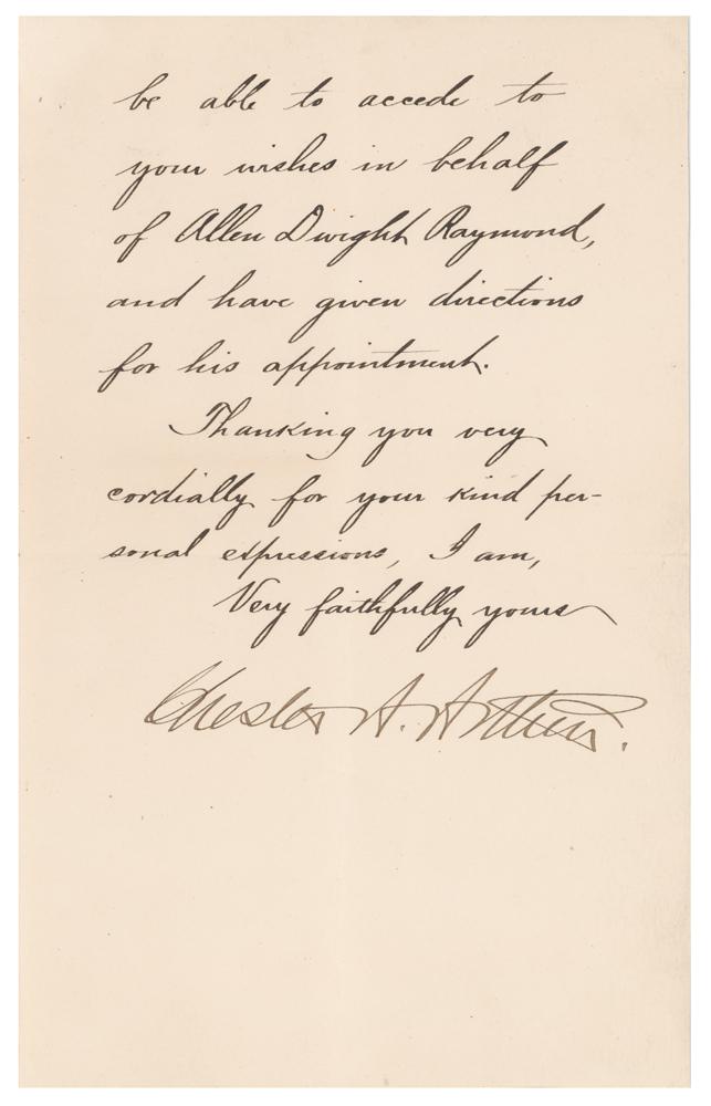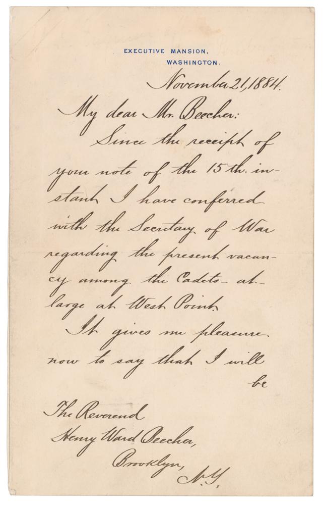 LS as president, two pages on two adjoining sheets, 5 x 8, Executive Mansion letterhead, November 21, 1884. Letter to the Reverend Henry Ward Beecher, in part: "Since the receipt of your note of the 15th instant I have conferred with the Secretary of War regarding the present vacancy among the Cadets-at-large at West Point. It gives me the pleasure now to say that I will be able to accede to your wishes in behalf of Allen Dwight Raymond, and have given directions for his appointment." In fine condition.