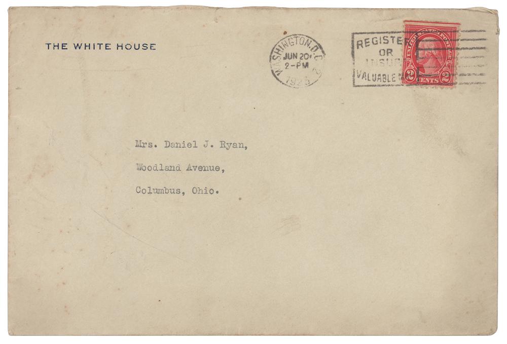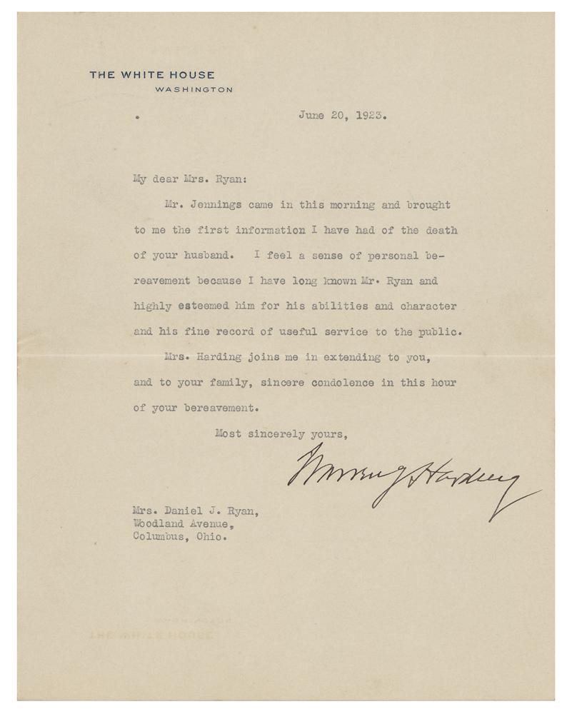 TLS as president, one page, 7 x 9, White House letterhead, June 20, 1923. Letter to Mrs. Daniel J. Ryan in Ohio, in full: "Mr. Jennings came in this morning and brought to me the first information I have had of the death of your husband. I feel a sense of personal bereavement because I have long known Mr. Ryan and highly esteemed him for his abilities and character and his fine record of useful service to the public. Mrs. Harding joins me in extending to you, and to your family, sincere condolence in this hour of your bereavement." In fine condition. Accompanied by the original White House mailing envelope. Daniel J. Ryan, who had passed away a week earlier, was a Republican politician in the Ohio House of Representatives (1884-1888) and Ohio Secretary of State (1889-1892).