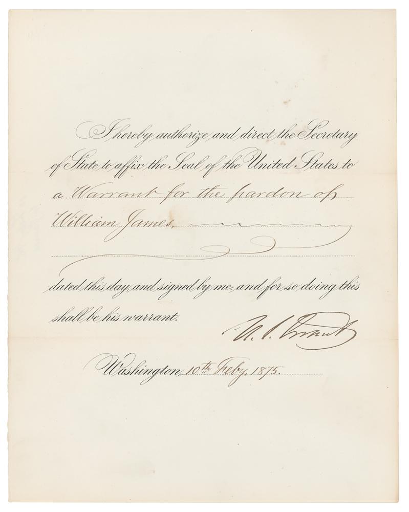 Partly-printed DS as president, one page, 7.75 x 9.75, February 10, 1875. President Grant directs the Secretary of State "to affix the Seal of the United States to a Warrant for the pardon of William James." Boldly signed at the conclusion by President Grant. In fine condition.