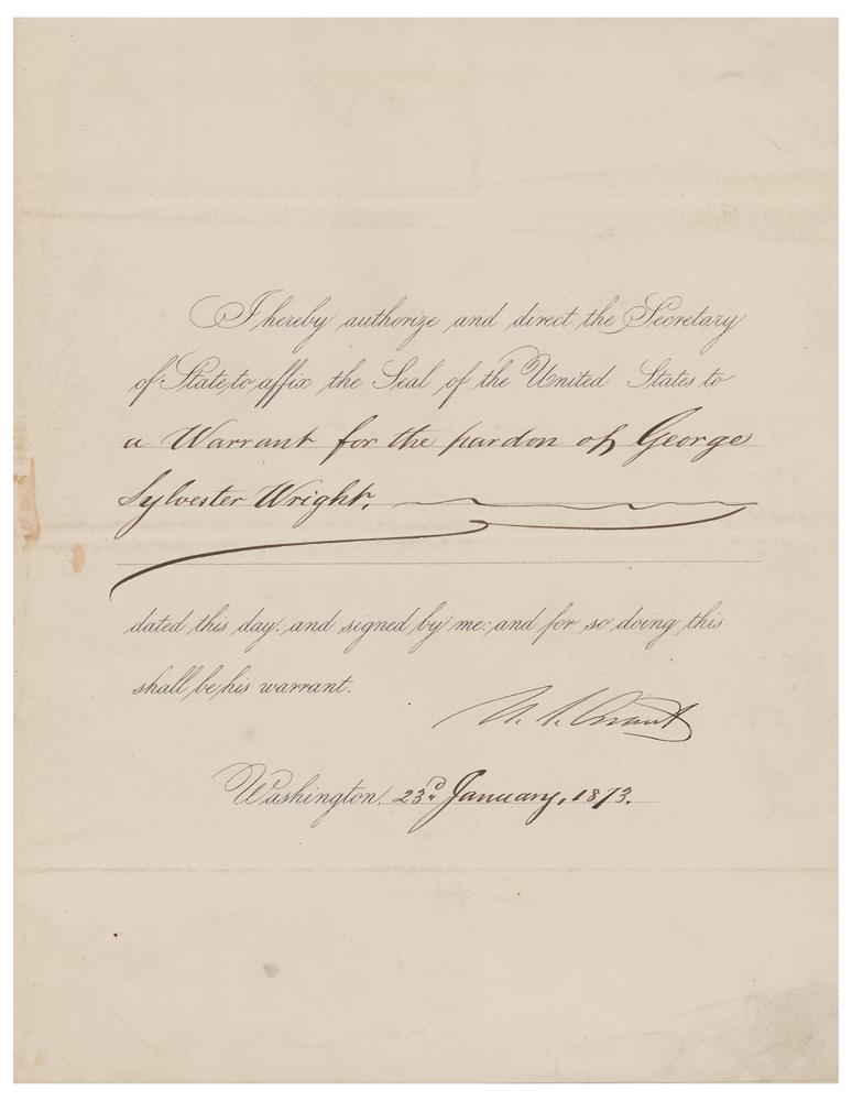 Partly-printed DS as president, one page, 8.25 x 10.75, January 23, 1873. President Grant directs the Secretary of State to "affix the Seal of the United States to a Warrant for the pardon of George Sylvester Wright." Crisply signed at the conclusion by President Grant. In very good to fine condition, with light edge creasing, and small stains to the left margin.