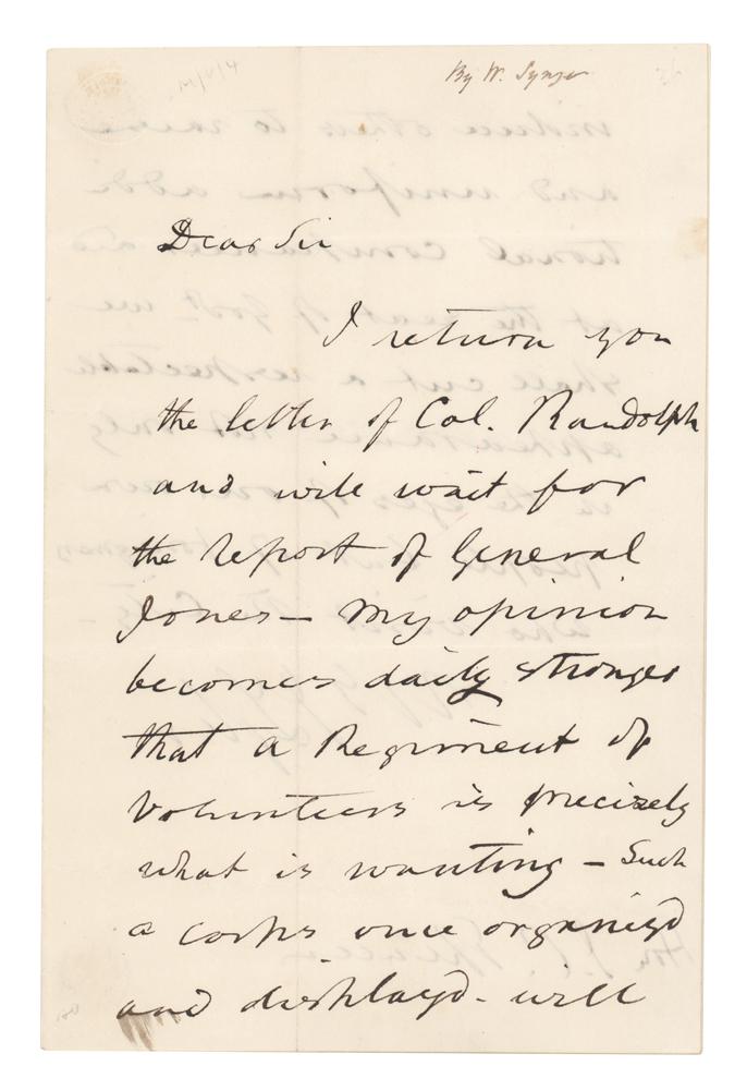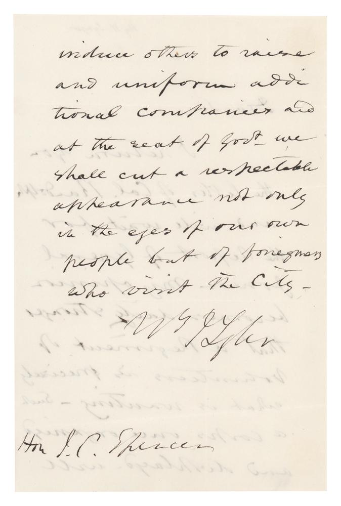 ALS signed “J. Tyler,” one page both sides, 4.75 x 7.25, no date. Handwritten letter to John Canfield Spencer, in full: "I return you the letter of Col. Randolph and will wait for the Report of General Jones. My opinion becomes daily stronger that a Regiment of Volunteers is precisely what is wanting. Such a corps once organized and displayed will induce others to raise and uniform additional companies and at the seat of gov't we shall cut a respectable appearance not only in the eyes of our own people but of foreigners who visit the city." In fine condition. John Canfield Spencer would be promoted to Tyler's cabinet as Secretary of War in 1841, and then as Secretary of the Treasury in 1843.