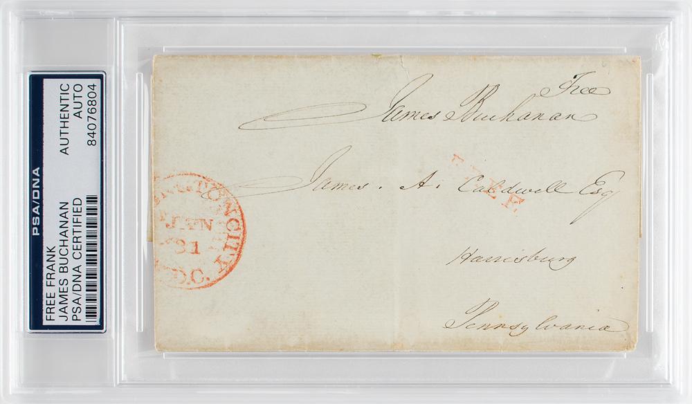 Hand-addressed and free franked mailing envelope, 5 x 3, addressed by Buchanan to "James A. Caldwell, Esq., Harrisburg. Pennsylvania," and franked in the upper right, "Free, James Buchanan." Postmarked at Washington, January 31, no year. In fine condition, with light soiling and a central vertical fold. Encapsulated in a PSA/DNA authentication holder.