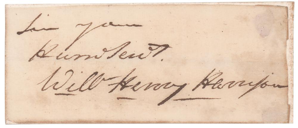 Ink signature, "Sir your Hum' Srv't, Will'm Henry Harrison,” on an off-white 3.75 x 1.5 sheet clipped from the close of a letter. Upper right corner of sheet is affixed to a same-size mount. In very good to fine condition, with light creasing and soiling. Accompanied by an engraving bearing a facsimile signature. A desirable autograph from the elusive ninth U.S. President.