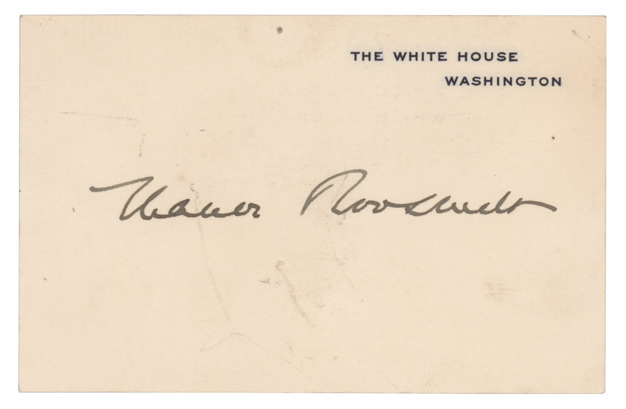 White House card, 4.25 x 2.75, signed in fountain pen by First Lady Eleanor Roosevelt. In fine condition, with light soiling, and a tack hole to the top edge. Accompanied by the original White House mailing envelope postmarked on September 17, 1935.