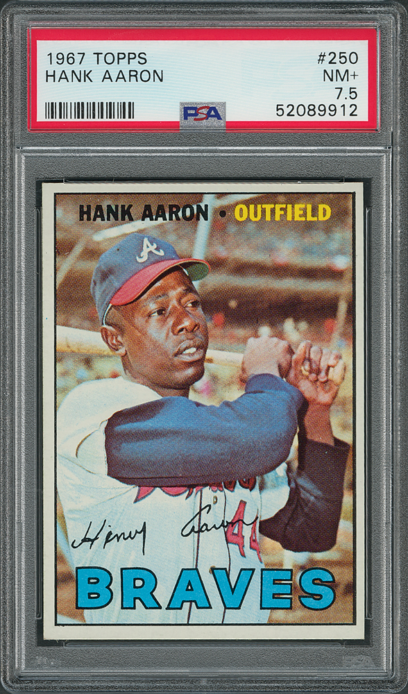 Graded by PSA NM+ 7.5. The veteran slugger Hank Aaron finishes a mighty swing on the front of his 1967 Topps card, issued in the year of his last National League home run title. Vivid coloration, sharp corners, and a great glossy sheen make this card a standout.
