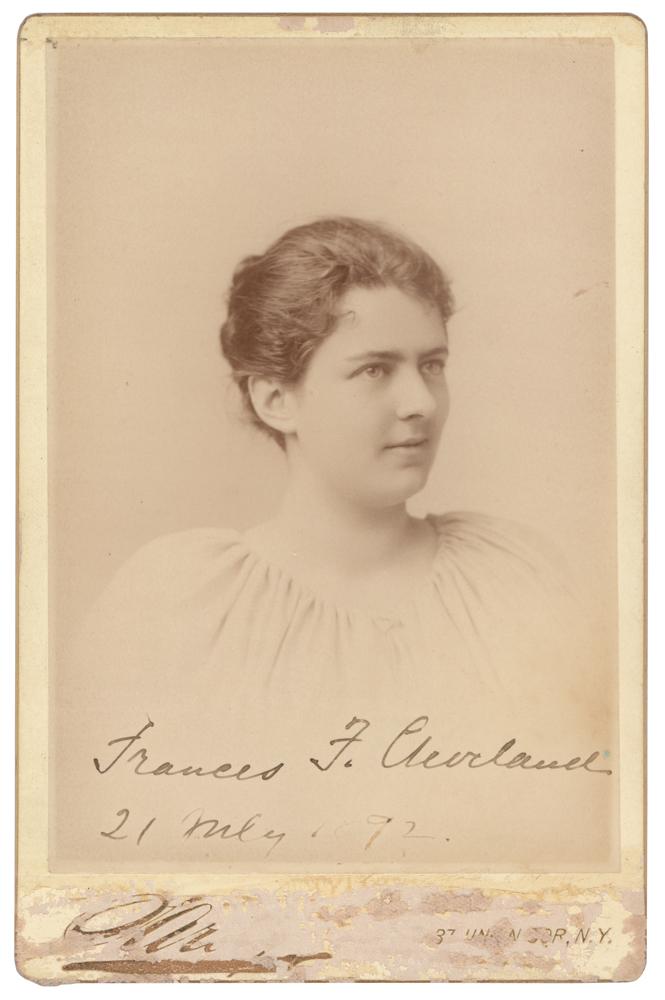 Attractive 4.25 x 6.5 cabinet photo of Frances Cleveland by Napoleon Sarony of New York, signed at the bottom of the image in ink, "Frances F. Cleveland, 21 July 1892." In very good condition, with mounting remnants to top and bottom borders, and some irregular ink adhesion to the date.