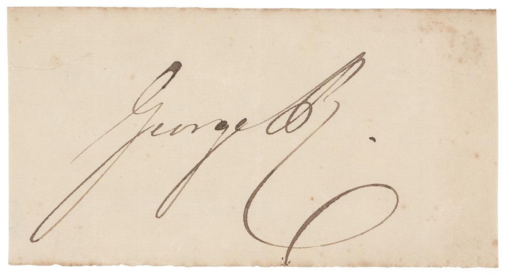 Huge ink signature, "George R," on an off-white 6 x 3.25 slip. In fine condition, with a tear to the upper left corner (not touching the signature).