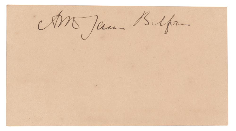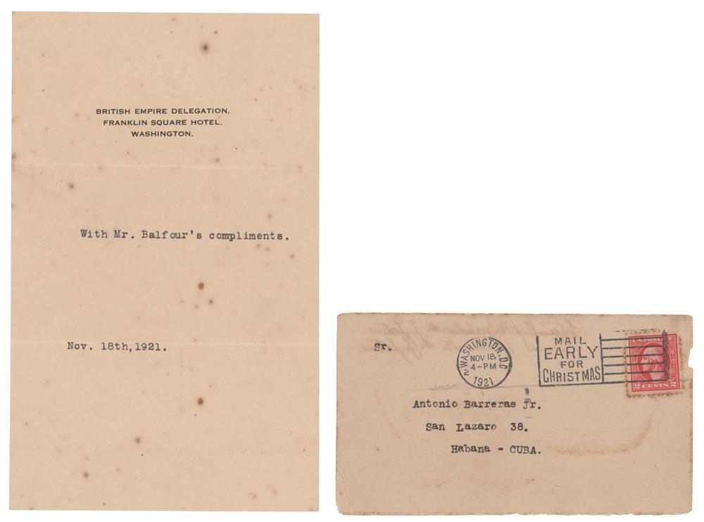 British Conservative statesman (1848-1930) who served as prime minister from 1902 to 1905; his Balfour Declaration, issued in 1917, established a national home in Palestine for the Jewish people. Ink signature, "Arthur James Balfour," on an off-white 5.25 x 2.75 card. In fine condition, with slight mottled foxing. Accompanied by the original mailing envelope and a transmittal slip from the British Empire Delegation, dated November 18, 1921.