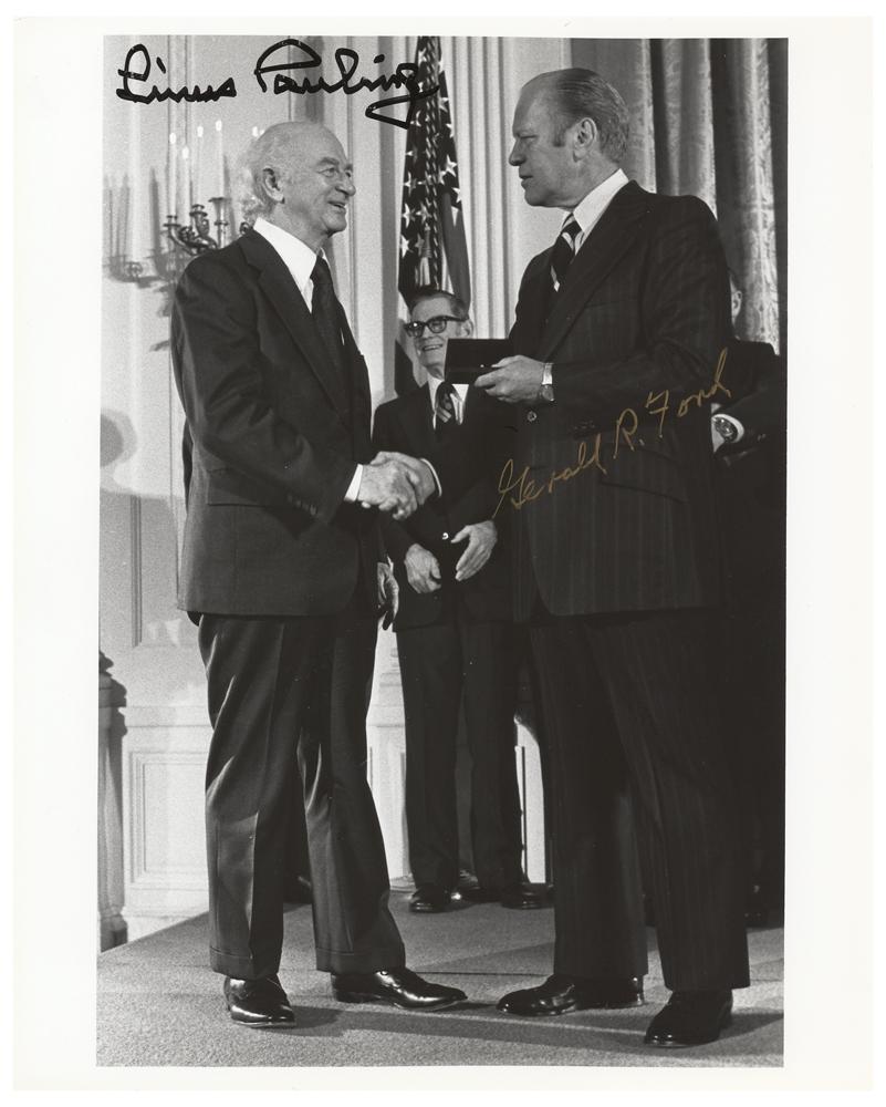 Glossy 8 x 10 photo of President Ford presenting Pauling with the National Medal of Science, signed in gold ink, "Gerald R. Ford," and in black felt tip, "Linus Pauling." In very fine condition.