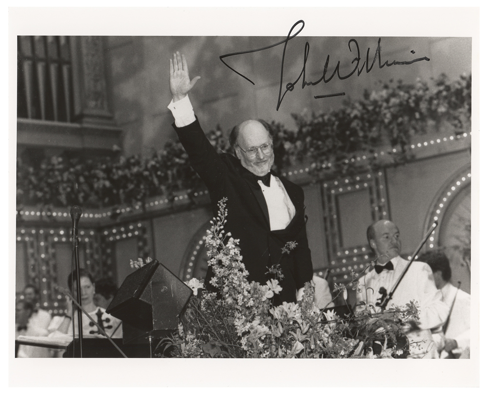 Glossy 10 x 8 photo of John Williams on stage as conductor of the Boston Pops Orchestra, signed in black felt tip. In fine condition, with trivial brushing to the last name.