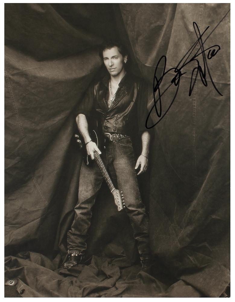 Outstanding 11.5 x 14.75 paperstock photo of Bruce Springsteen with his guitar removed from a portrait book, signed in black felt tip. In very fine condition.