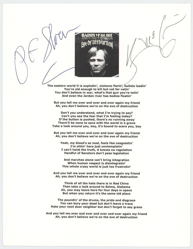 Printed lyric sheet for the 1965 hit single 'Eve of Destruction,' 8.5 x 11, signed in black and blue ballpoint by singer-songwriters Barry McGuire and P. F. Sloan. The lyrics, in part: "The eastern world it is explodin', violence flarin', bullets loadin' / You're old enough to kill but not for votin' / You don't believe in war, but what's that gun you're totin' / And even the Jordan river has bodies floatin' / But you tell me over and over and over again my friend / Ah, you don't believe we're on the eve of destruction." In very fine condition.